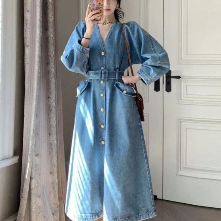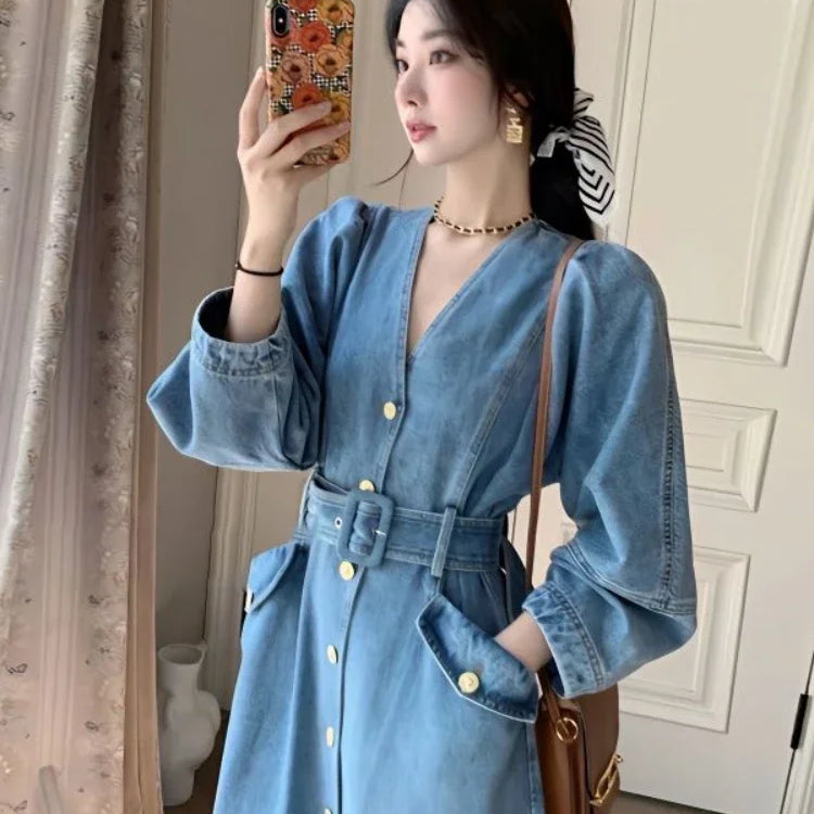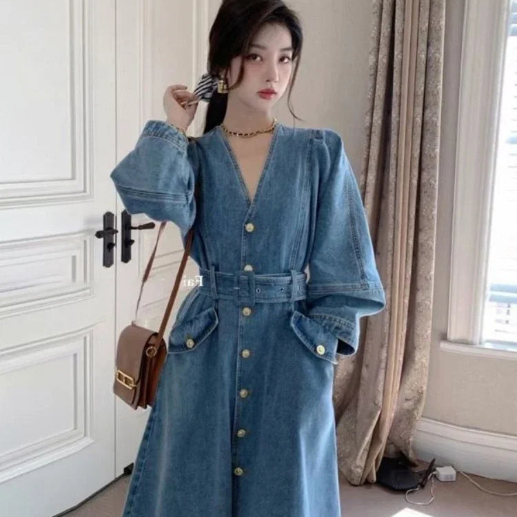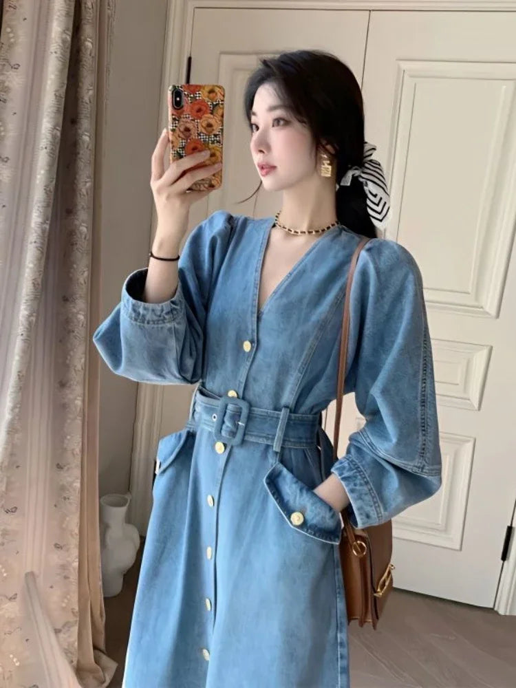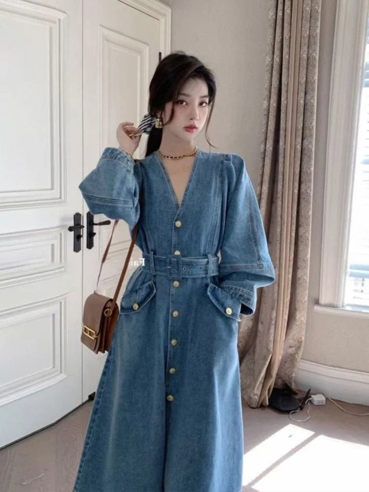 فساتين للنساء الخريف الخامس الرقبة مزاجه كاوبوي فساتين فضفاضة الصلبة رداء الكورية موضة تنوعا ألف خط فستان طويل