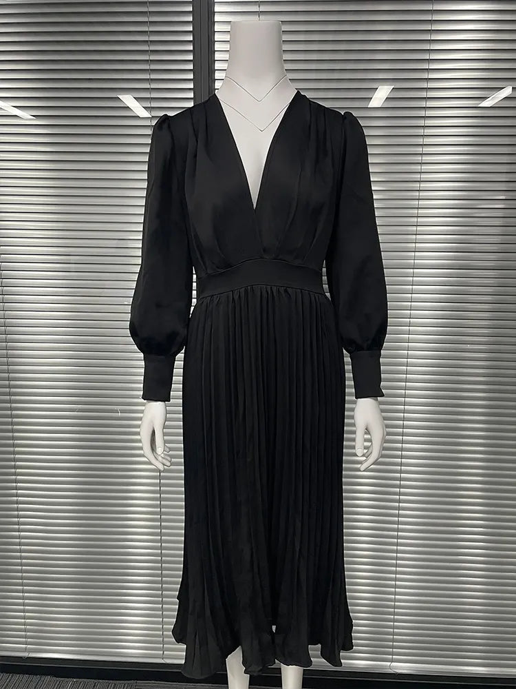 Drauuing أسود الكاحل طول فساتين النساء الخامس الرقبة طويلة الأكمام فضفاضة أنيقة مكتب سيدة أضعاف فساتين النساء الخريف جديد