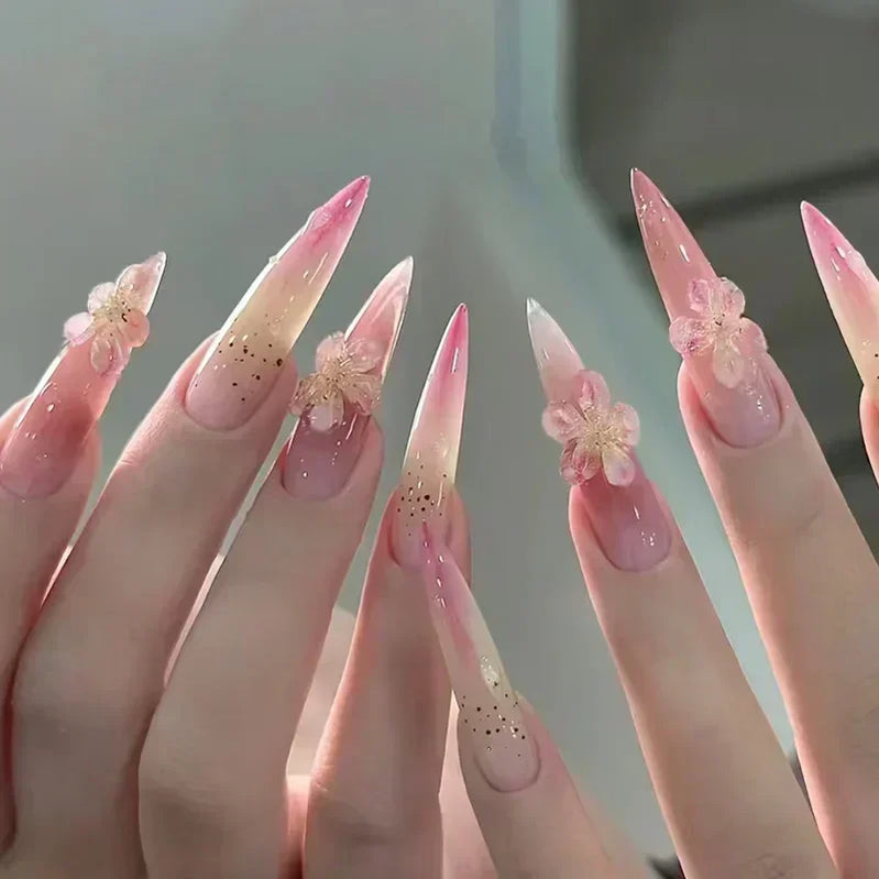 24Pcs French False Nails With Purple Edge Almond Bow Flower Design Detachable Acrylic Fake Nails Long Stiletto Press On Nails