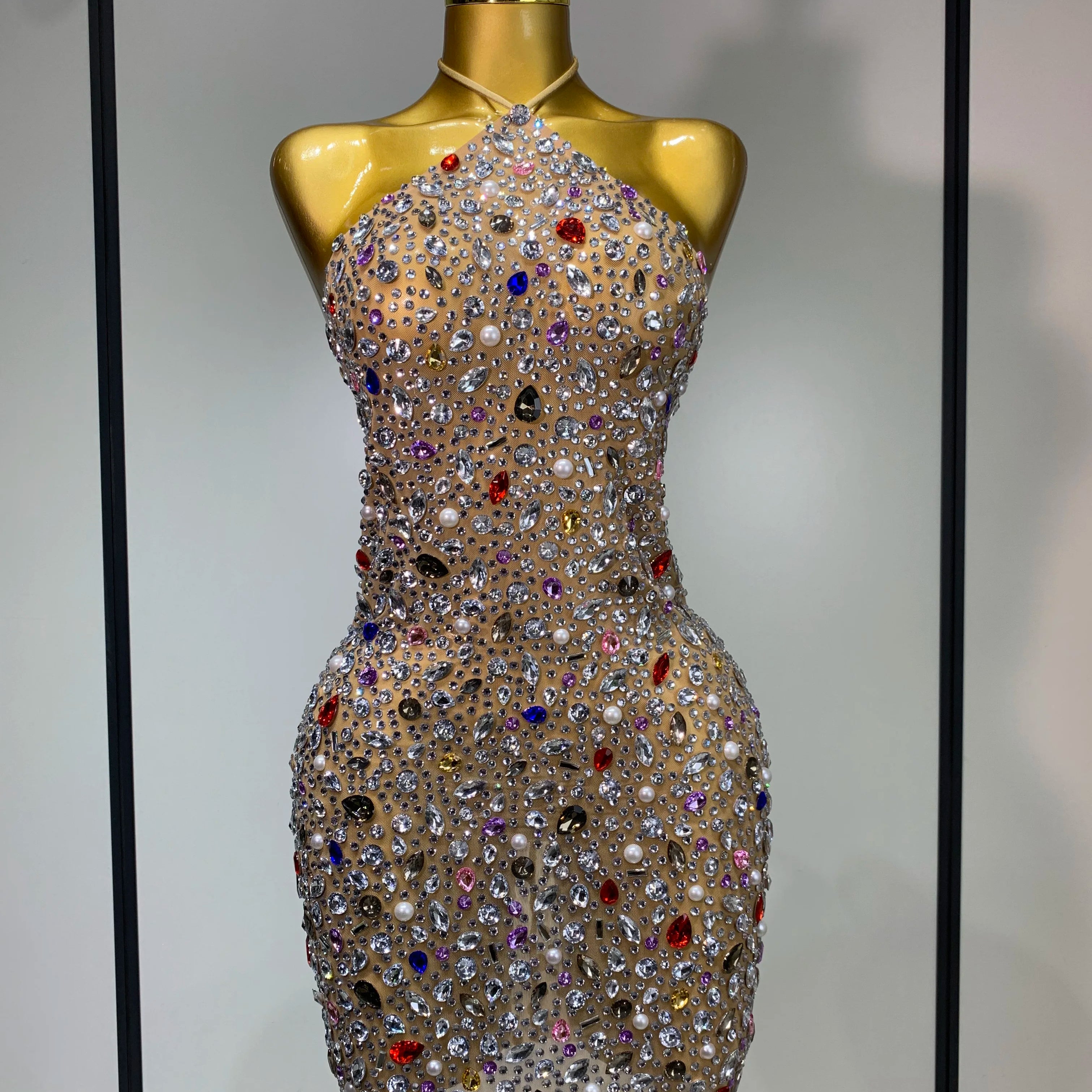 Colorful Crystals Diamond Women Sexy Halter Mesh See Through Bodycon Dress Nightclub Evening Party Celebrate Birthday Costume
