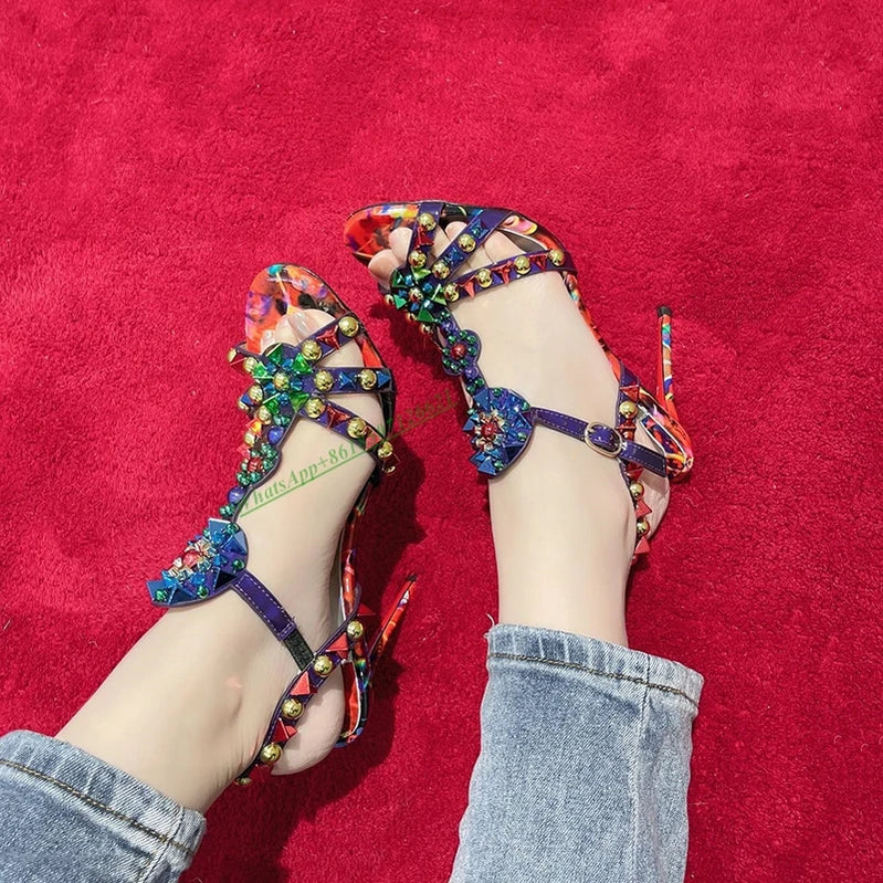 Farve rund tå åben tå kryds stropp nitte sandaler kvinders læder stiletto t-strap højhælede sko