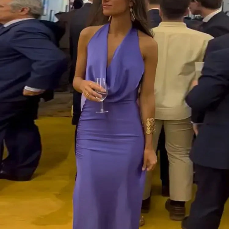 Elegant Purple Halter Lace Up Bodycon Midi Dress Women Sexy Blackless Sleeveless Side Split Robes Chic Summer Lady Party Dresses