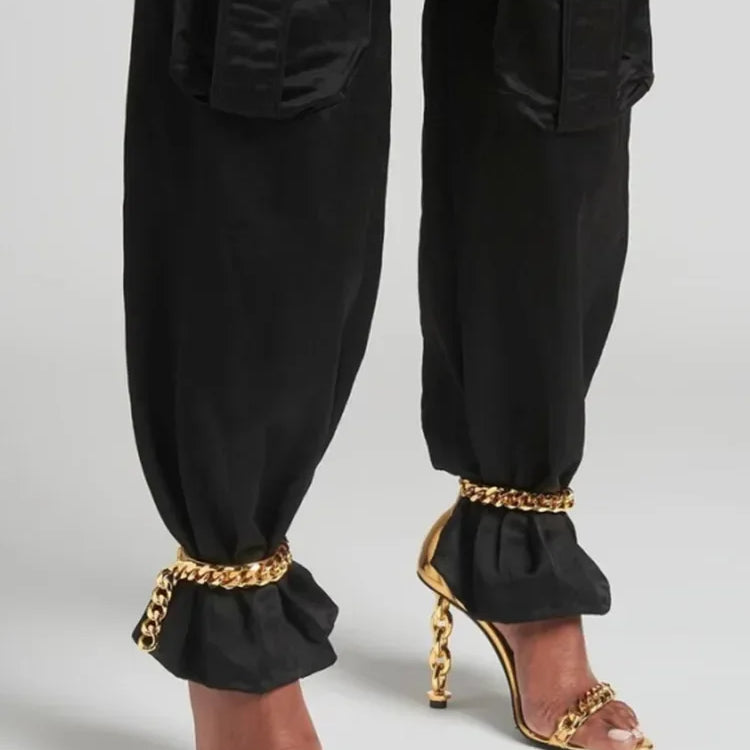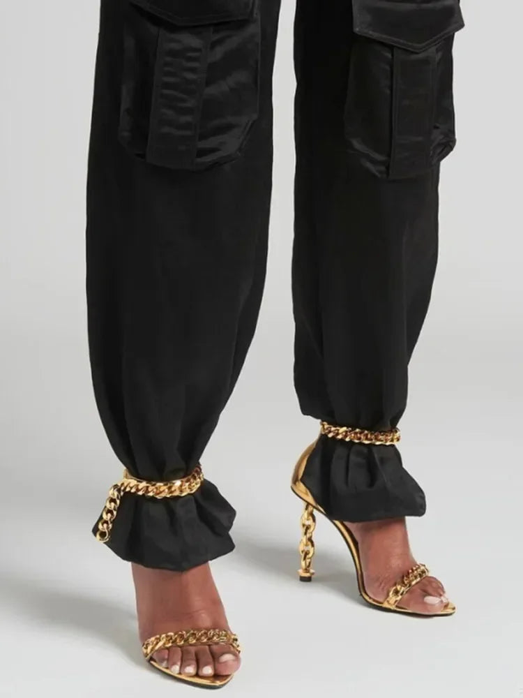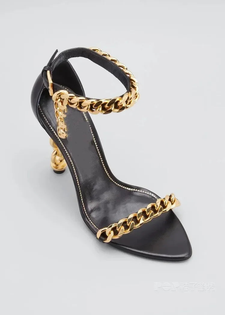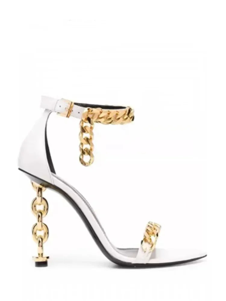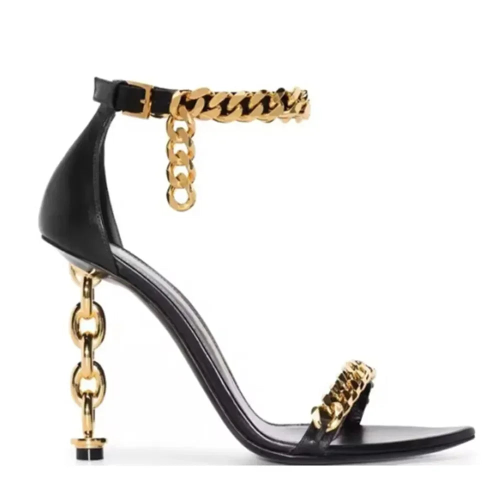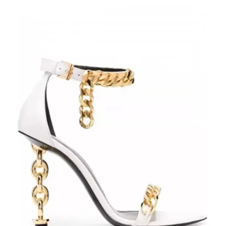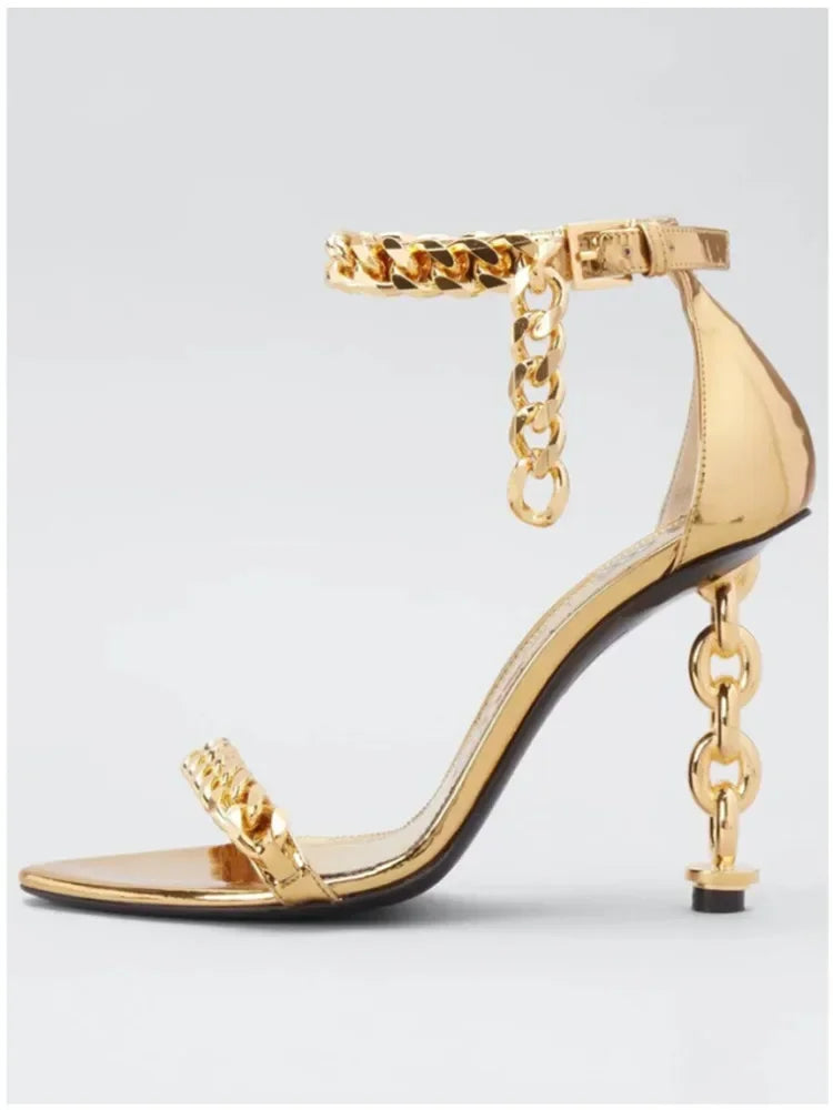 Europäische und amerikanische Sommer neue Metallkette High Heel Sandalen Modenschau einer Linie sexy offene Zähne Frauen Sandalen