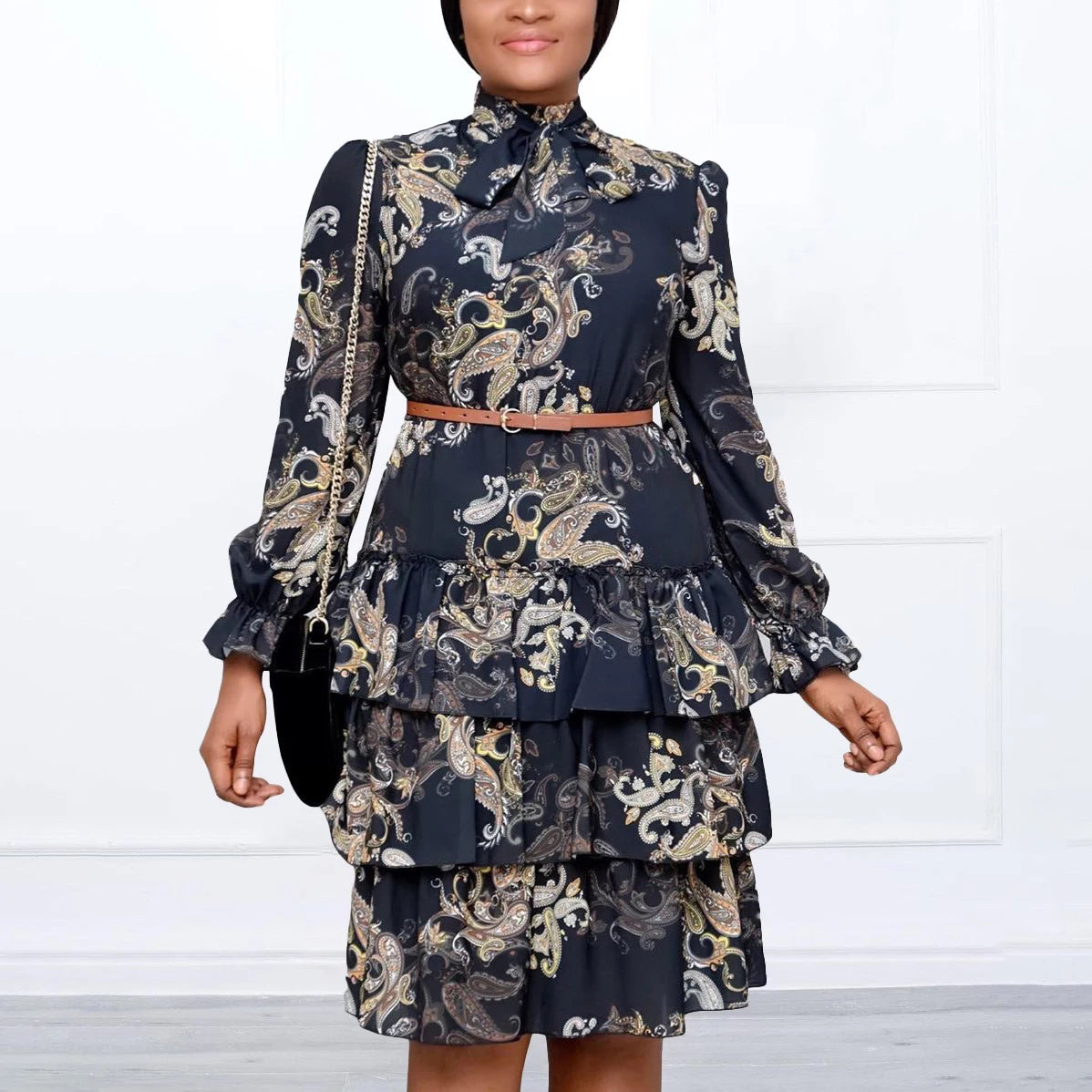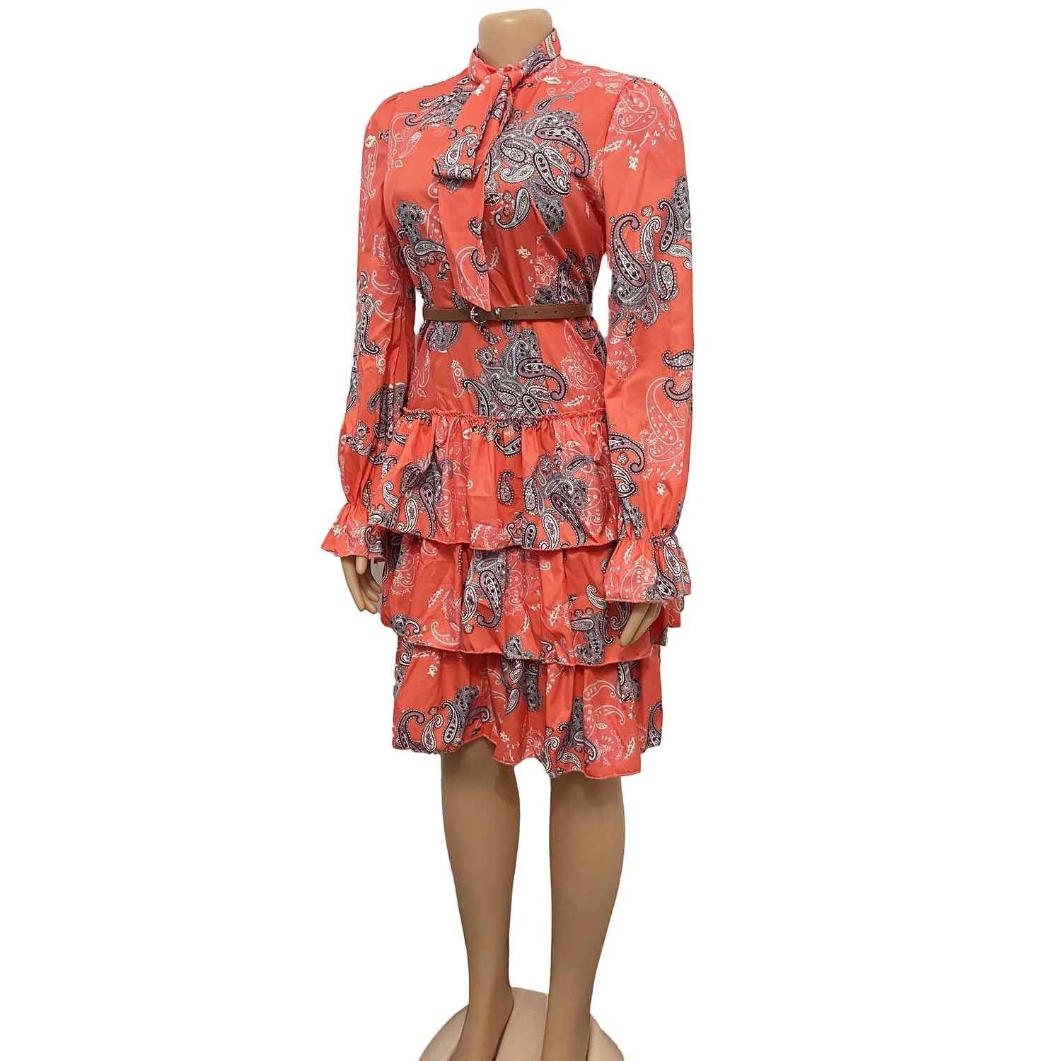 Elegant Office Ladies Dresses for Women Bow Collar Full Sleeve Belt Waisted Ruffles Knee Length Formal Business Work Vestidos OL