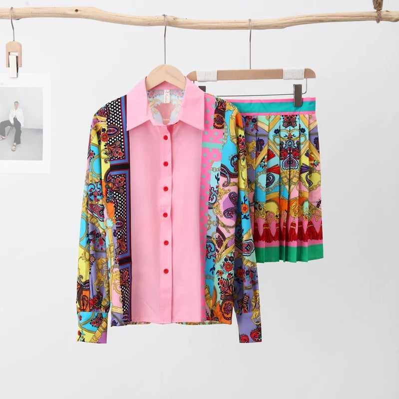 Elegant Print Short Shirt Skirts Sets Women Pink Lantern Long Sleeve Shirts Mini Pleated Female Summer Slim Ladies Suit