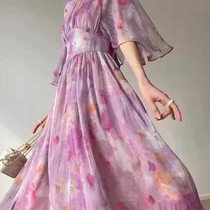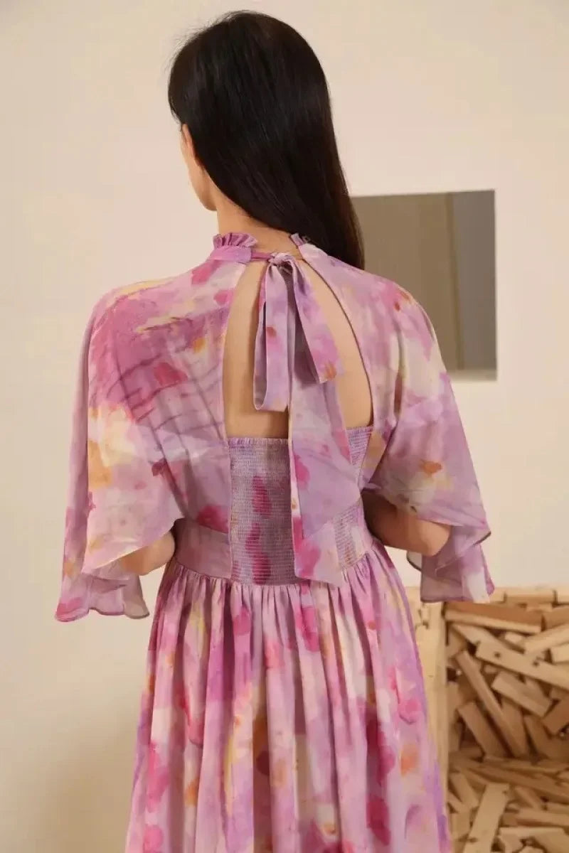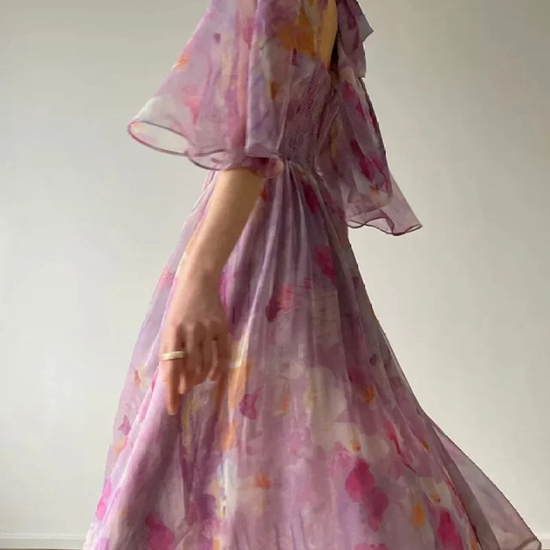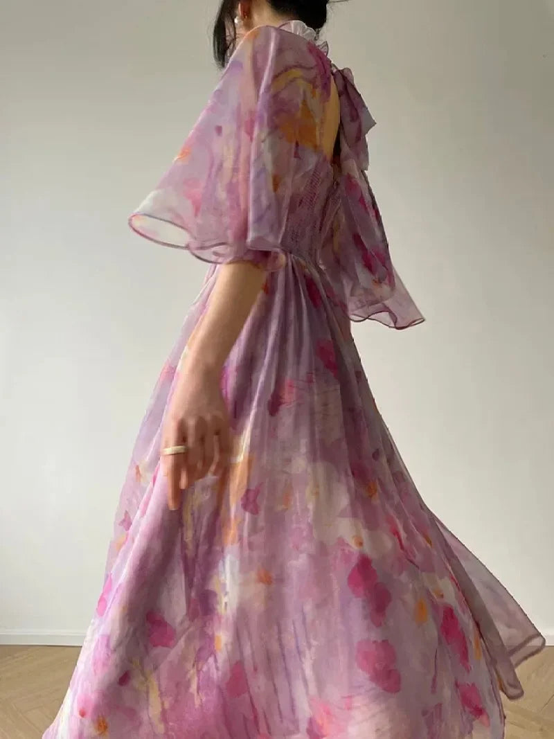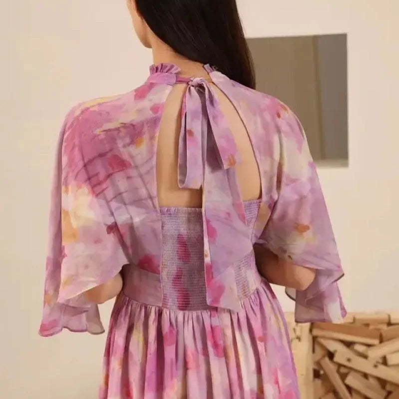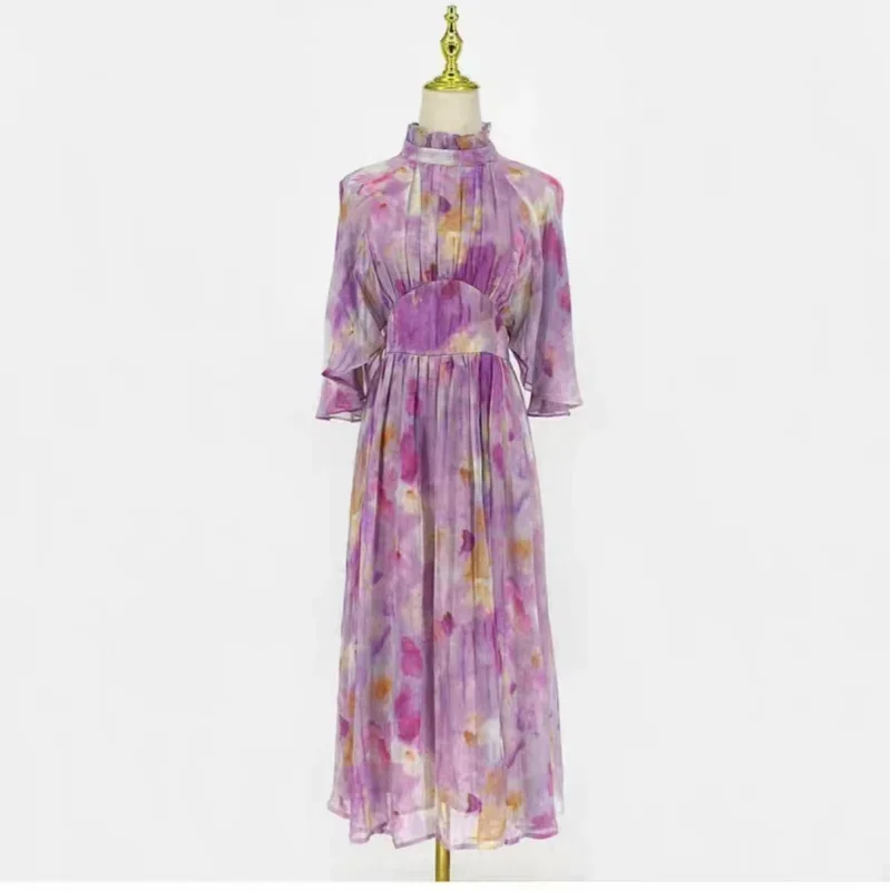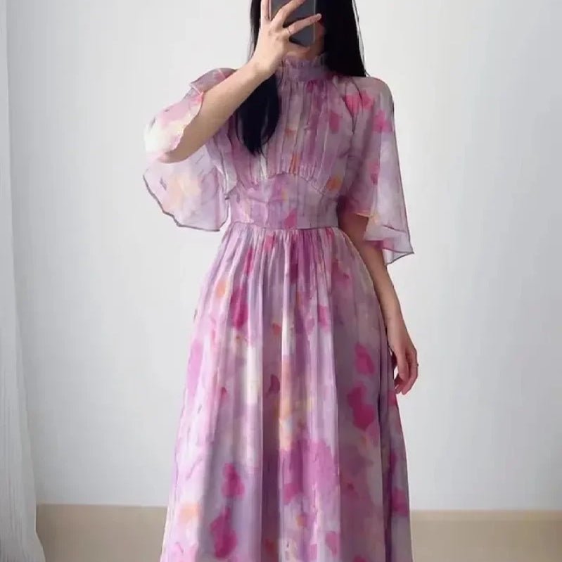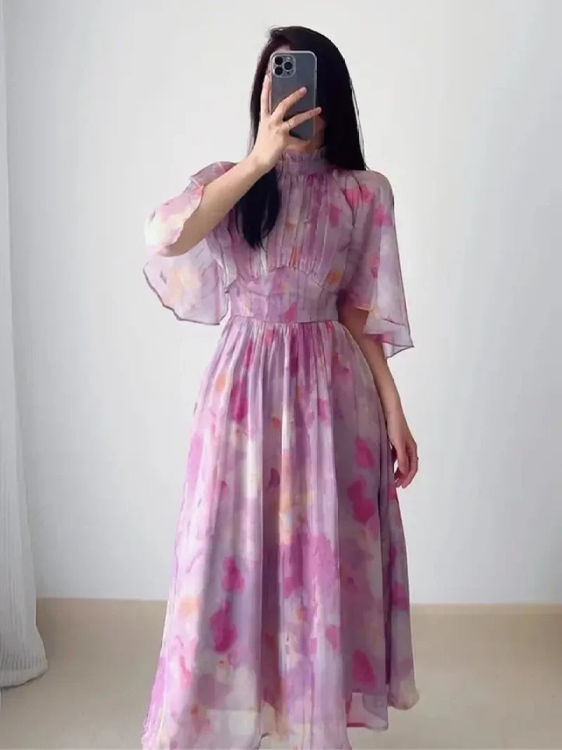 Elegant Print Slim Dresses For Women Stand Collar Half Sleeve High Waist Ruched Long Dress Female Summer Big Hem Backless Style