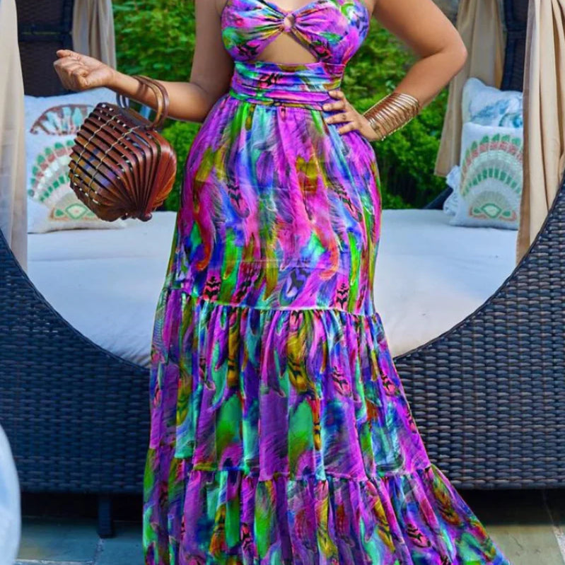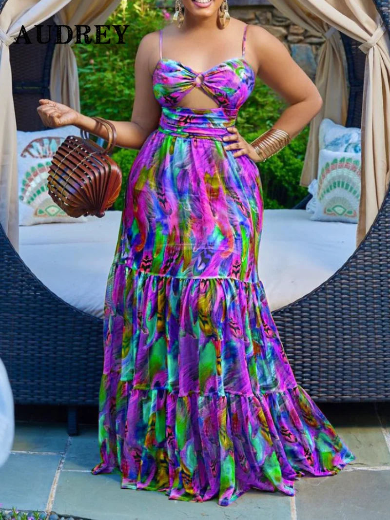 Elegant Sling Plus Size Dress Sexy Printing Fashion Backless Boho Beach Mixi Dress Robe Femme Ete Leisure Vacation Vestidos