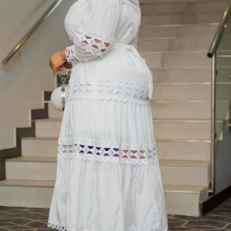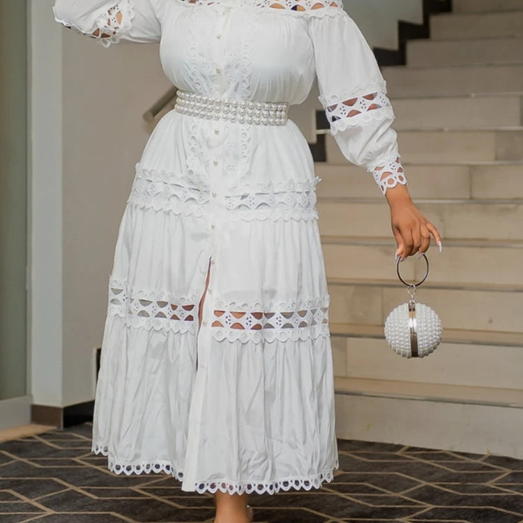 Elegant Women Hollow Out Lace Splice Mock Neck Lantern Long Sleeve Midi Dress with Belt Casual Party Club Outfits Plus Size