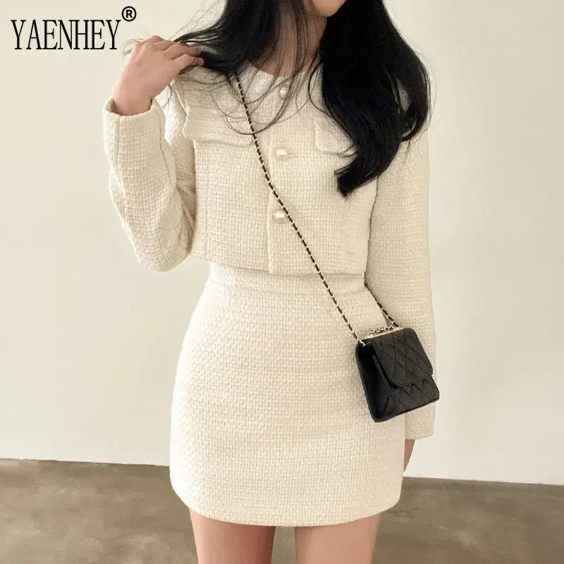 Elegantes chaquetas de tweed para mujeres trajes otoño invierno moda coreana y2k botones de manga larga abrigos de cultivo + juegos de traje de falda