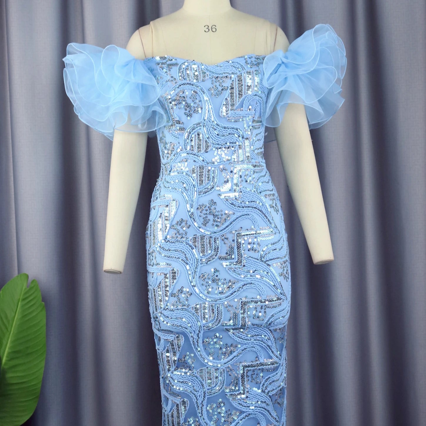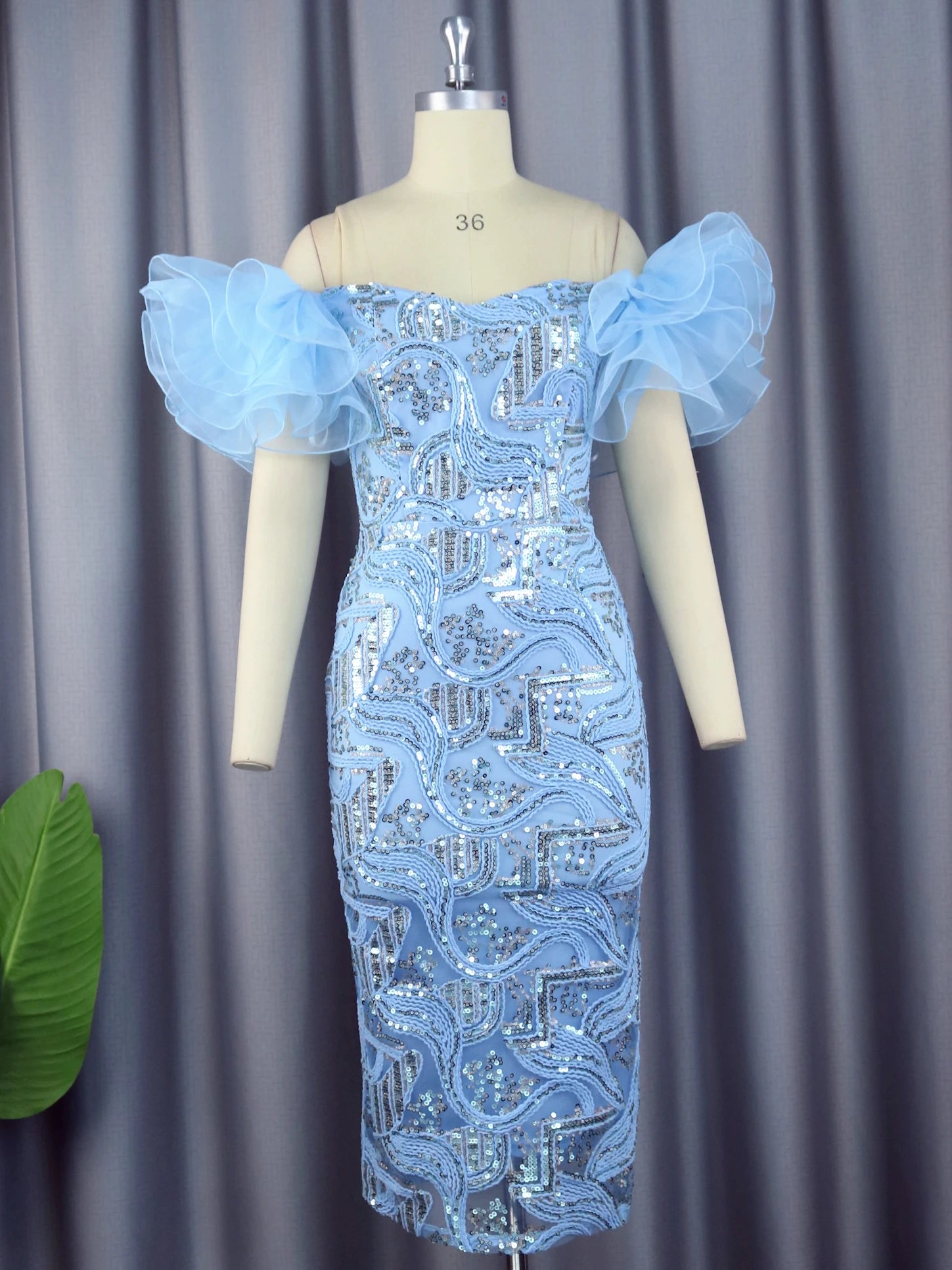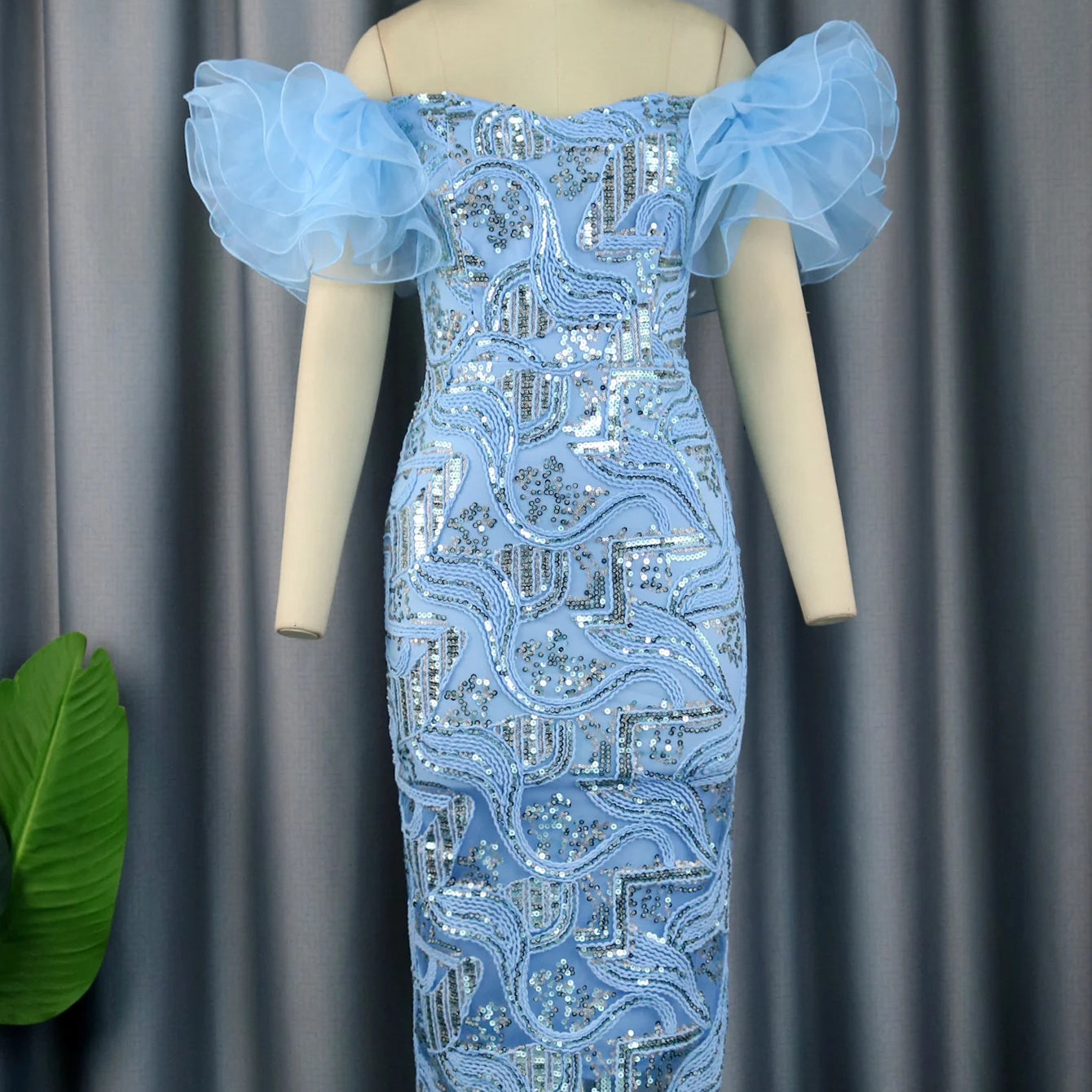 Embroidery Sequins Dresses for Women Plus Size 4XL Blue Luxury Off Shoulder Glitter Ruffles Cocktail Wedding Party Prom Outfits