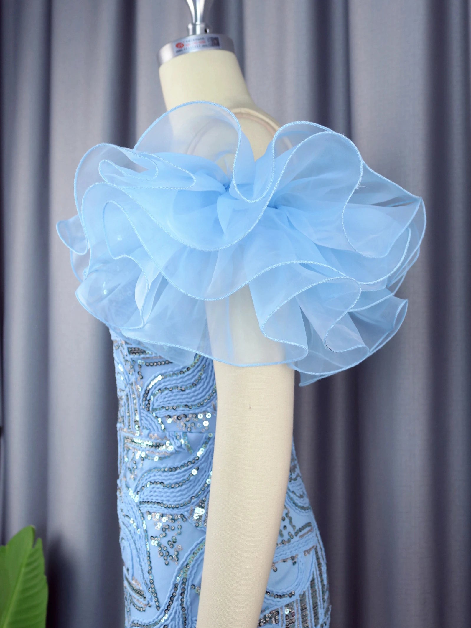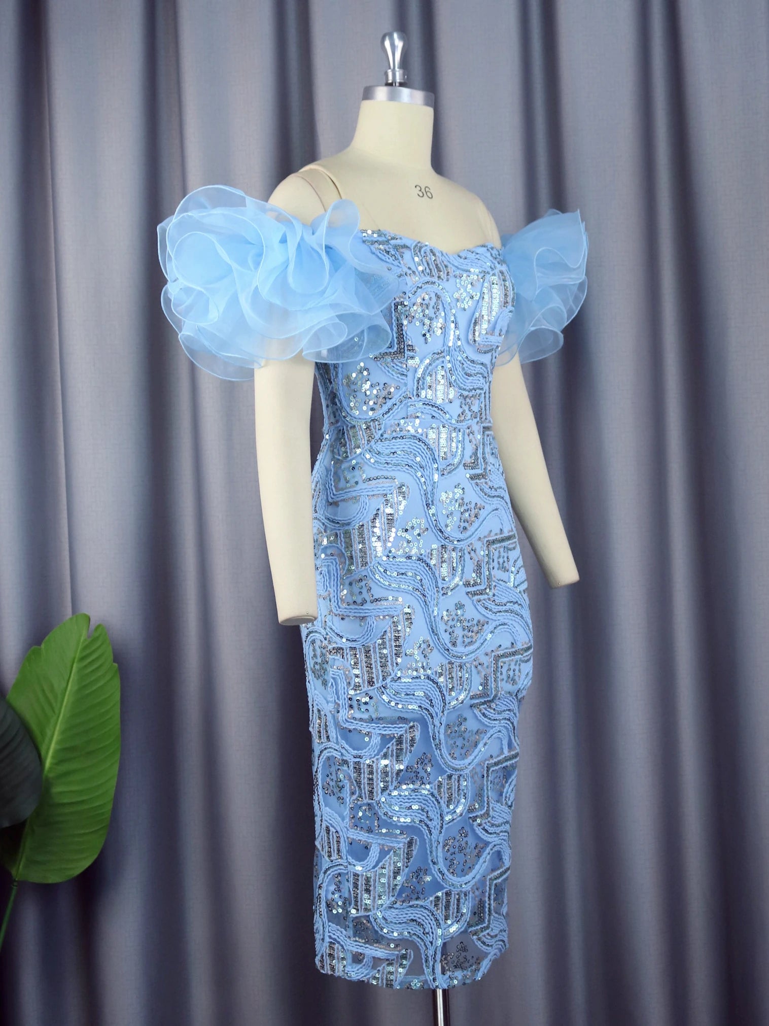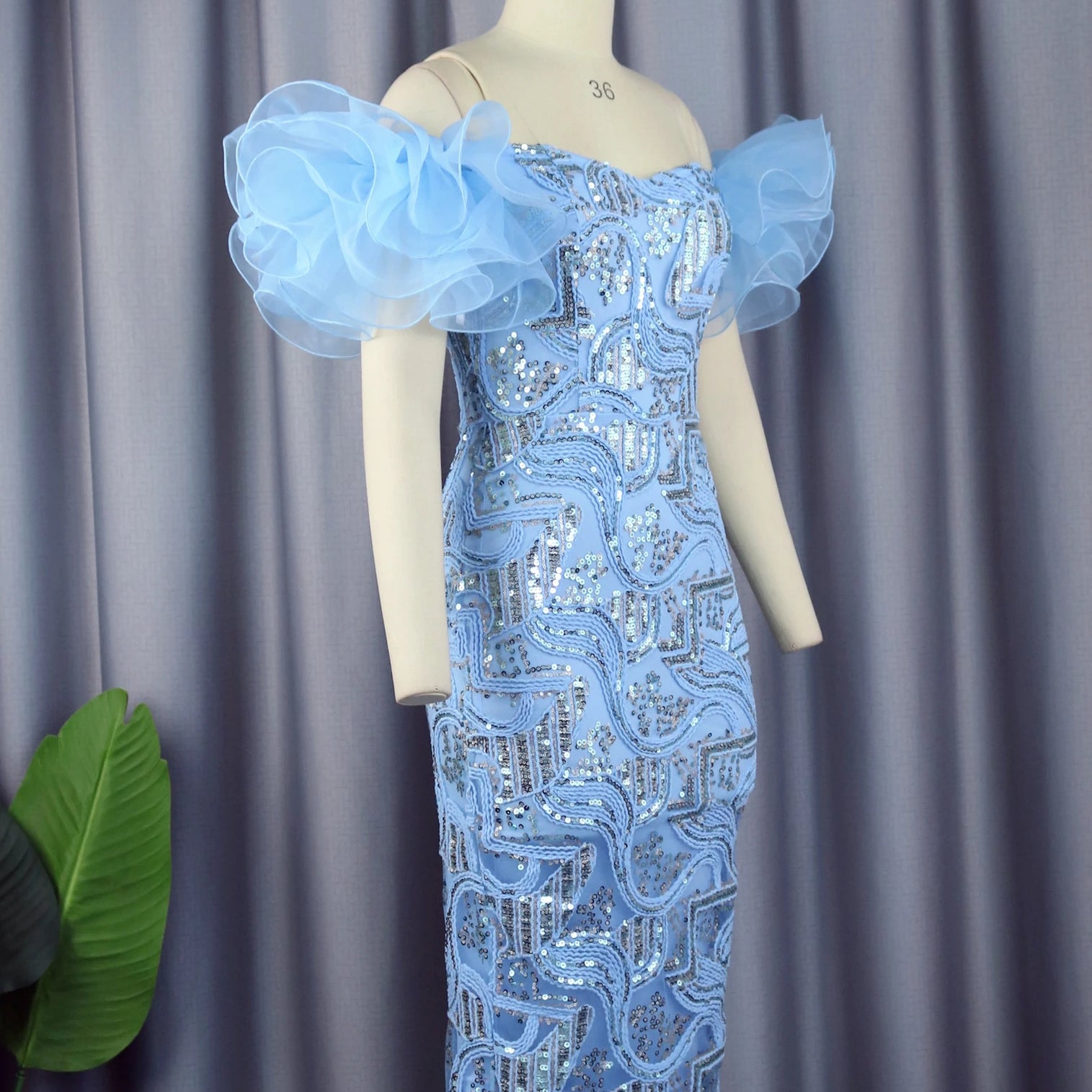 Embroidery Sequins Dresses for Women Plus Size 4XL Blue Luxury Off Shoulder Glitter Ruffles Cocktail Wedding Party Prom Outfits