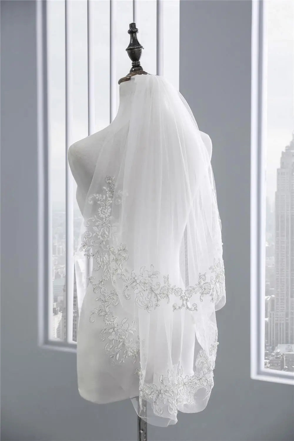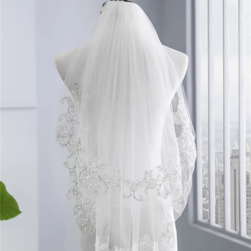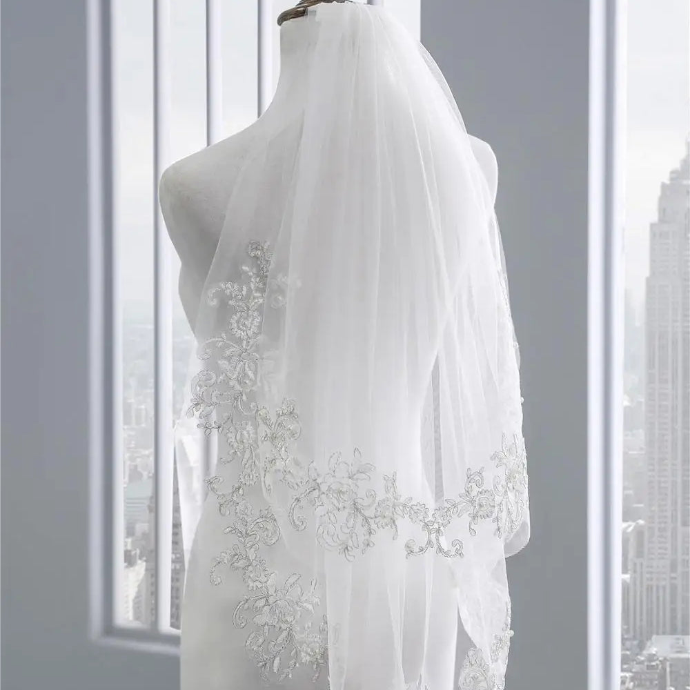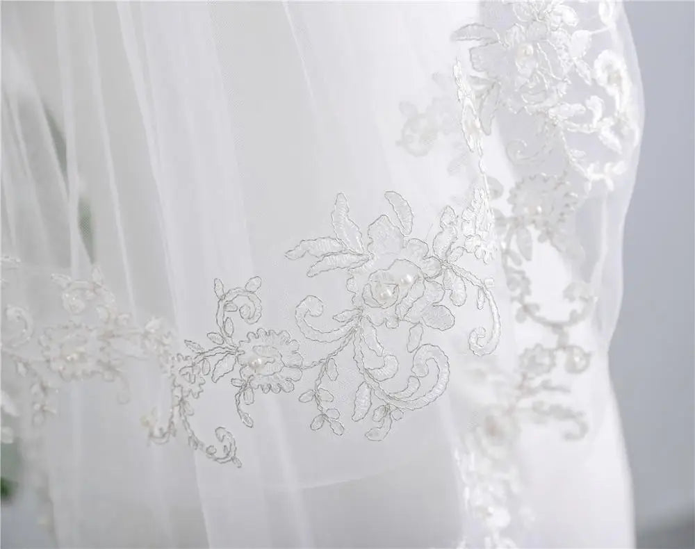 European Short Bridal Veils with Comb White Romantic Lace Appliques Edge Pearls Bride Veil for Wedding Dress Cheap