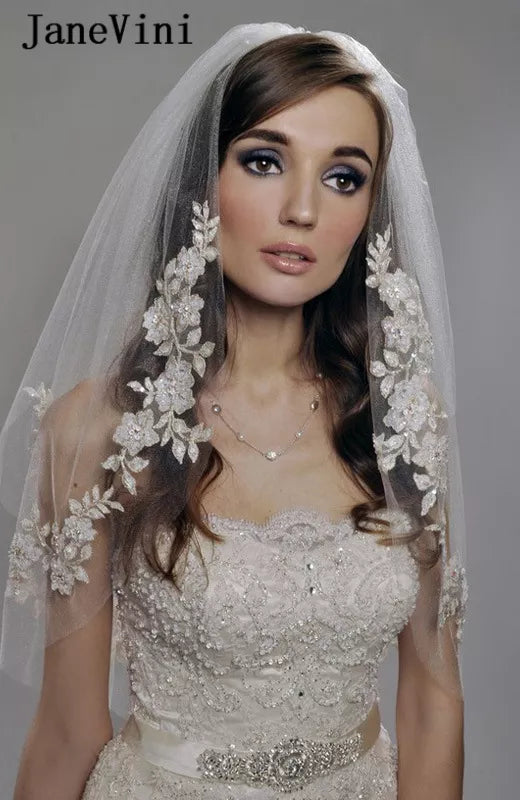 JaneVini 2021 European Short Bridal Veils with Comb White Romantic Lace Appliques Edge Pearls Bride Veil for Wedding Dress Cheap