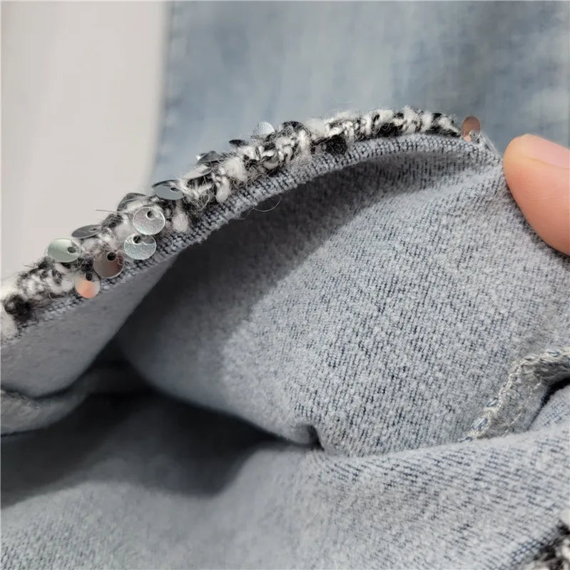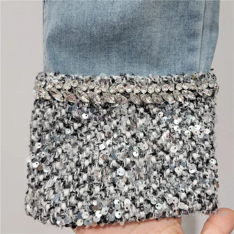 Jeans azules europeos Mujer Otoño e Invierno Nuevos pantalones de rizado de lentejuelas de lentejuelas rectas de costura alta