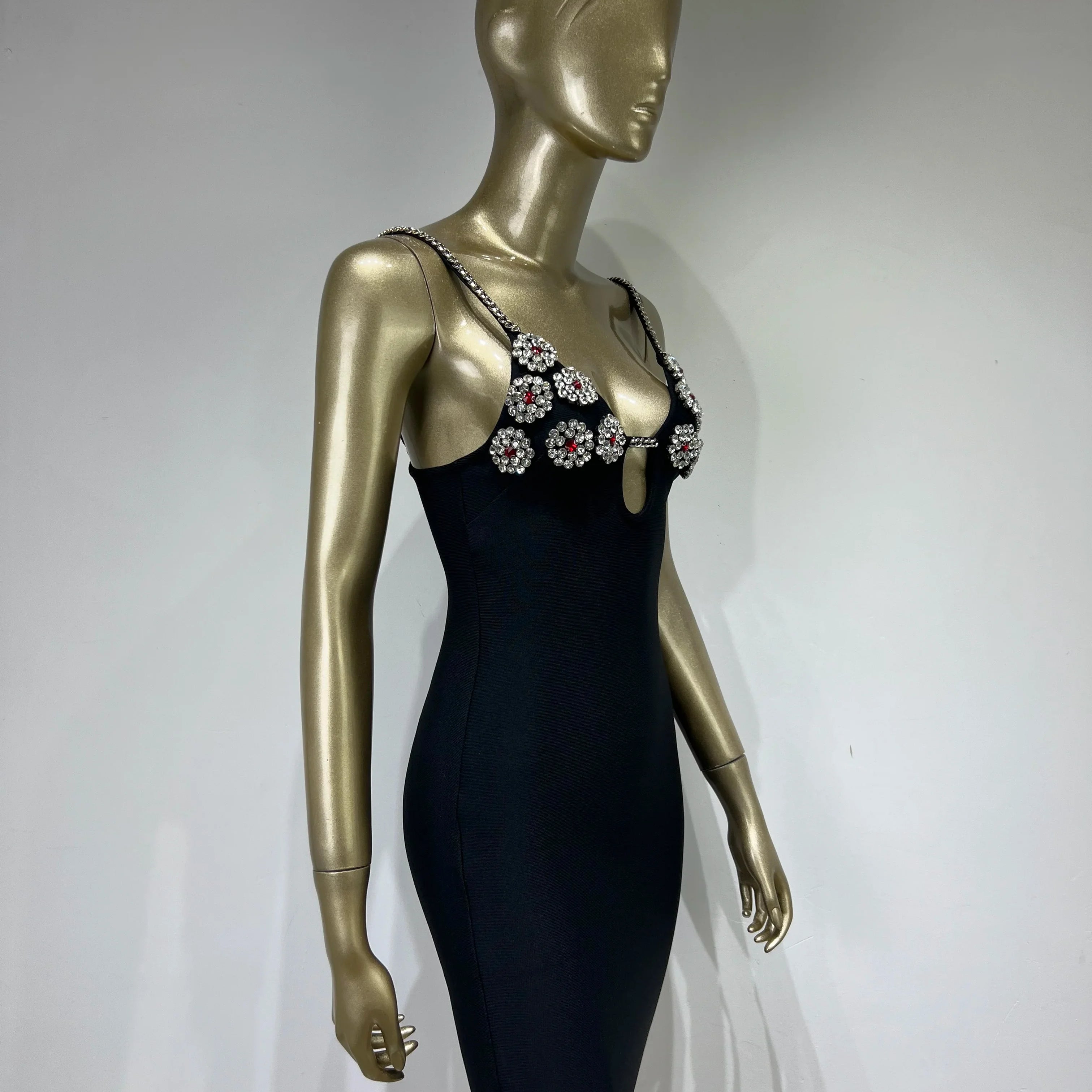 est Women Summer Fashion Sexy Key Hole Crystal Diamonds Black Mini Bandage Dress Elegant Evening Club Party Dress