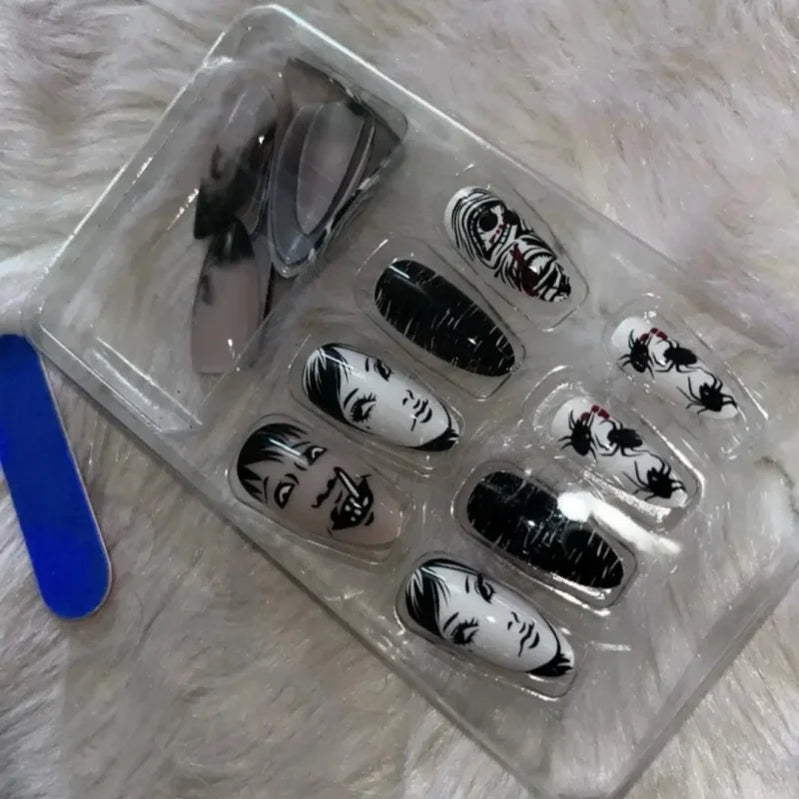 24Pcs Horror Comic Tomie Press on Nails Almond Glossy Black Japanese Anime Nails Reusable Halloween False Nail Tips for Girls