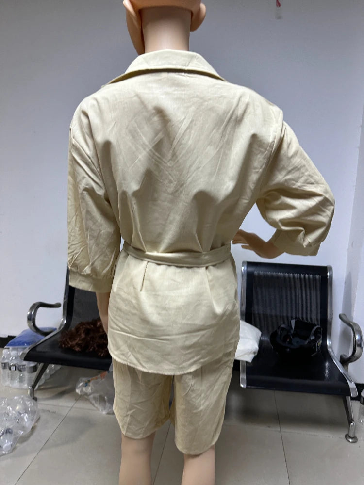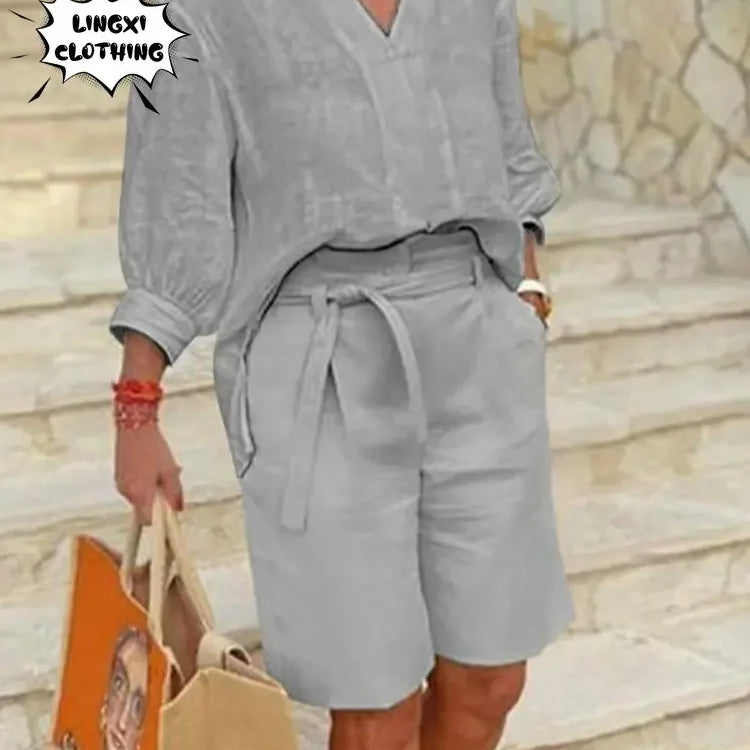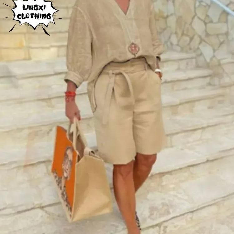2024 Summer Fashion Plus Size New Matching Collection Women's Shorts Set V-neck Short Sleeves Sports Cotton Linen Two Piece Set