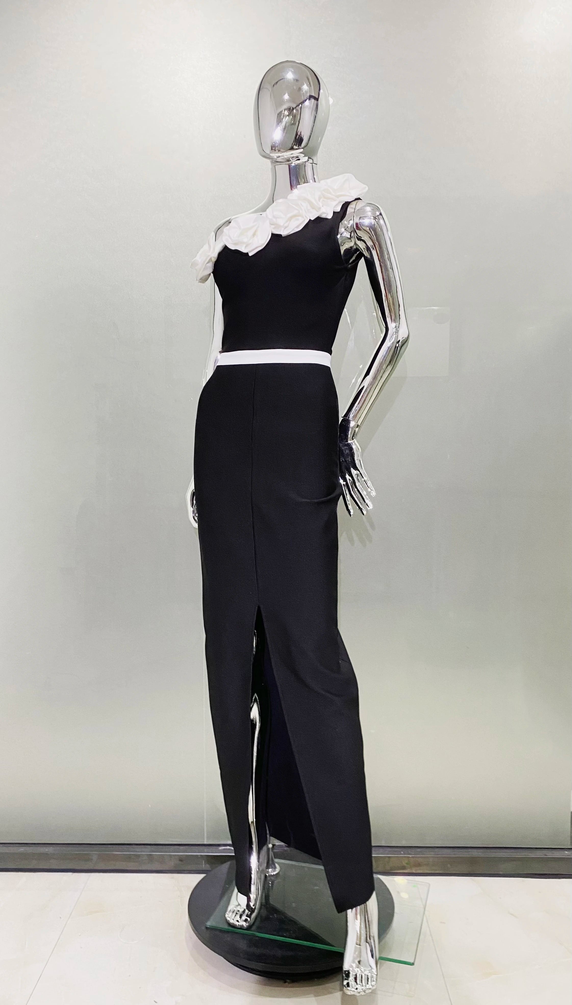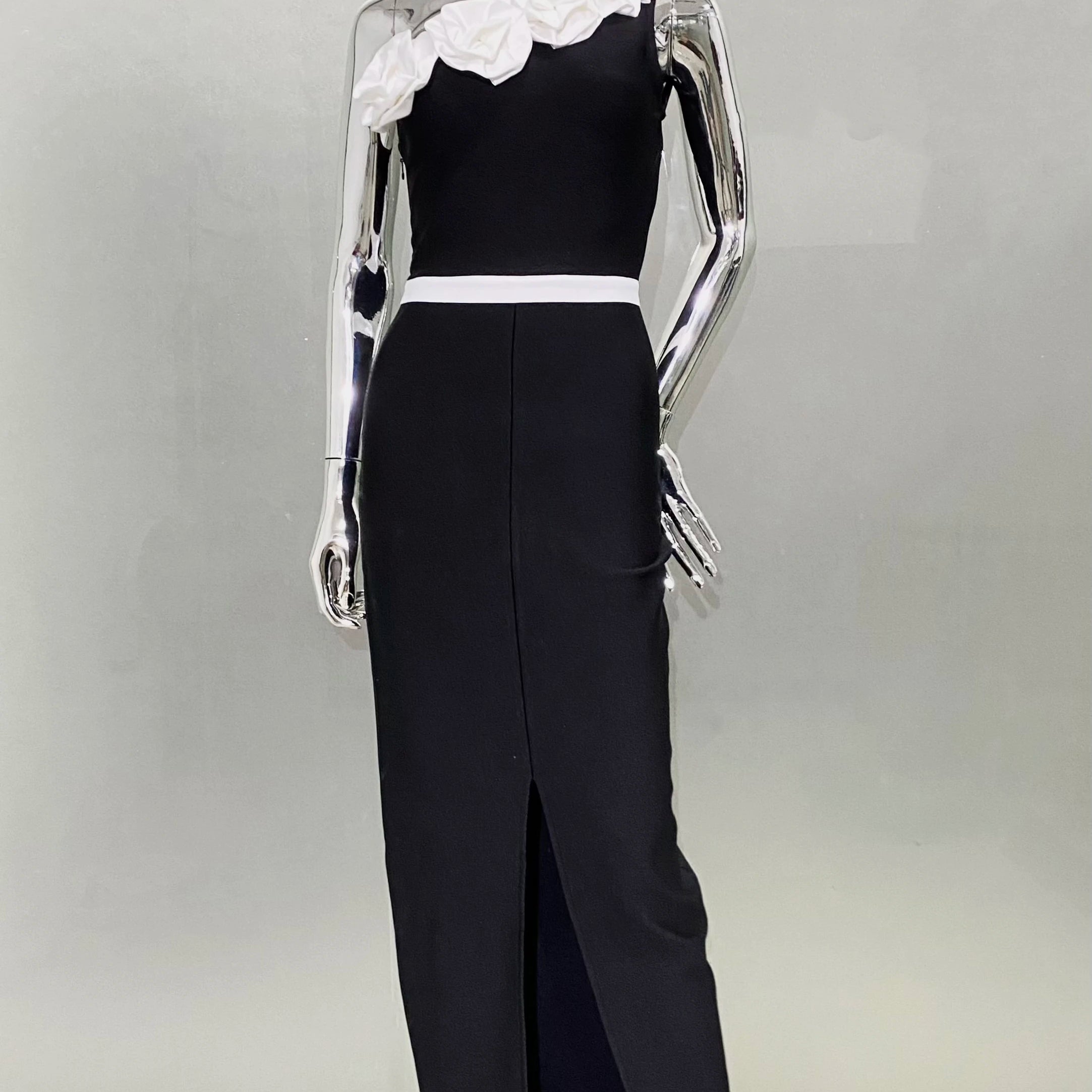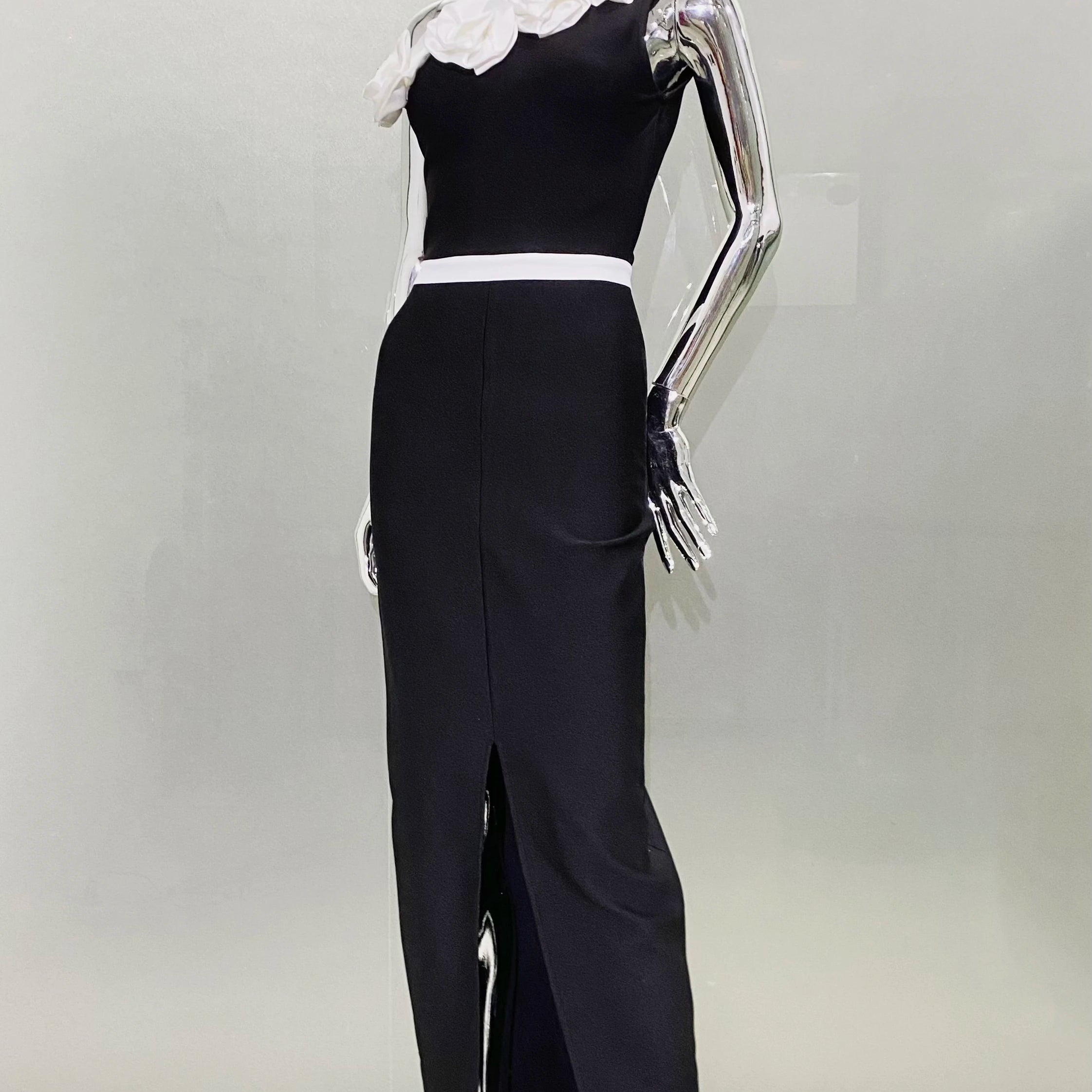 2024 Summer White Flowers One Shoulder Black Ankle Length Bandage Dress Graceful Woman Evening Dress Celebrity Party Outfit