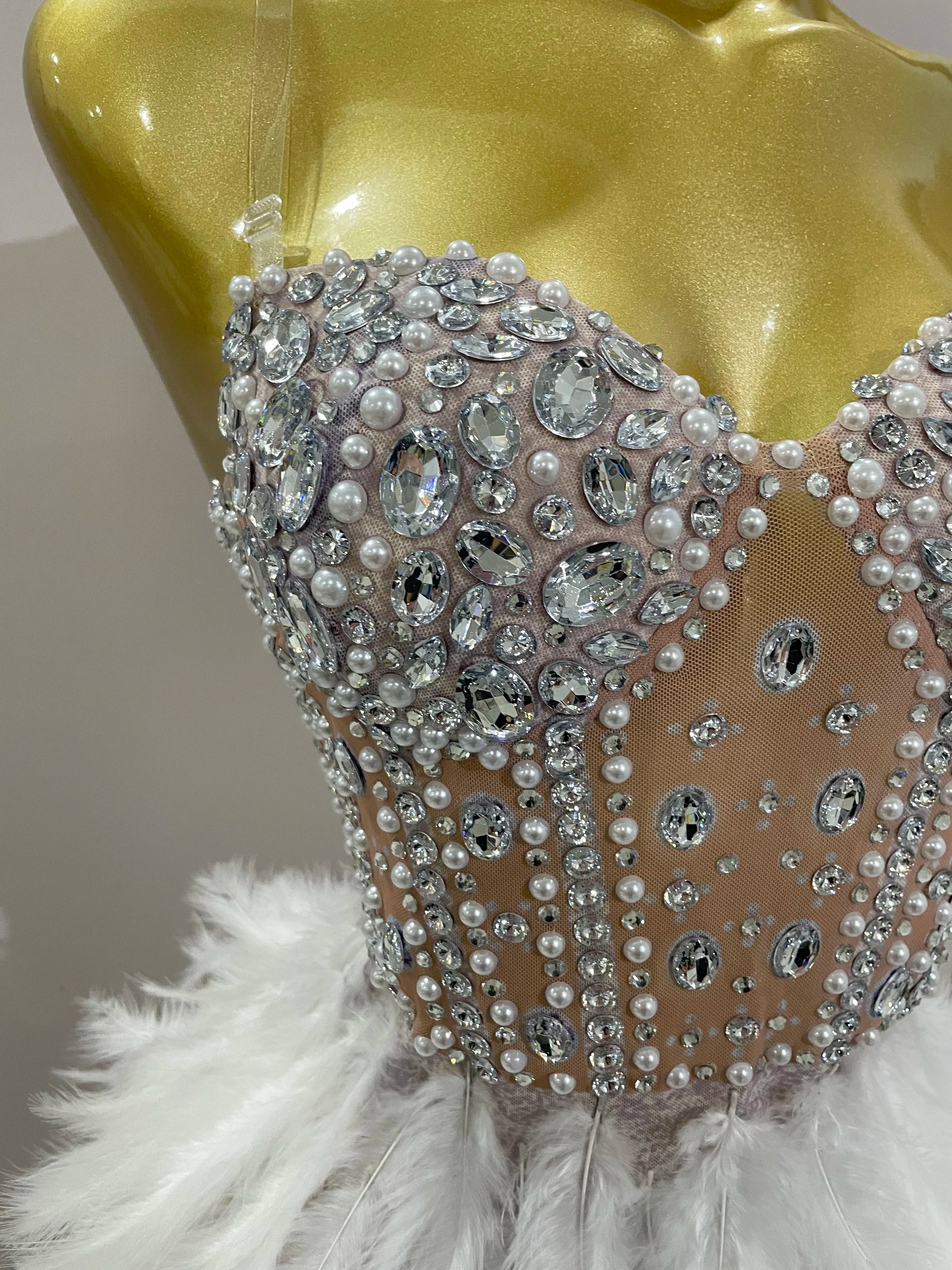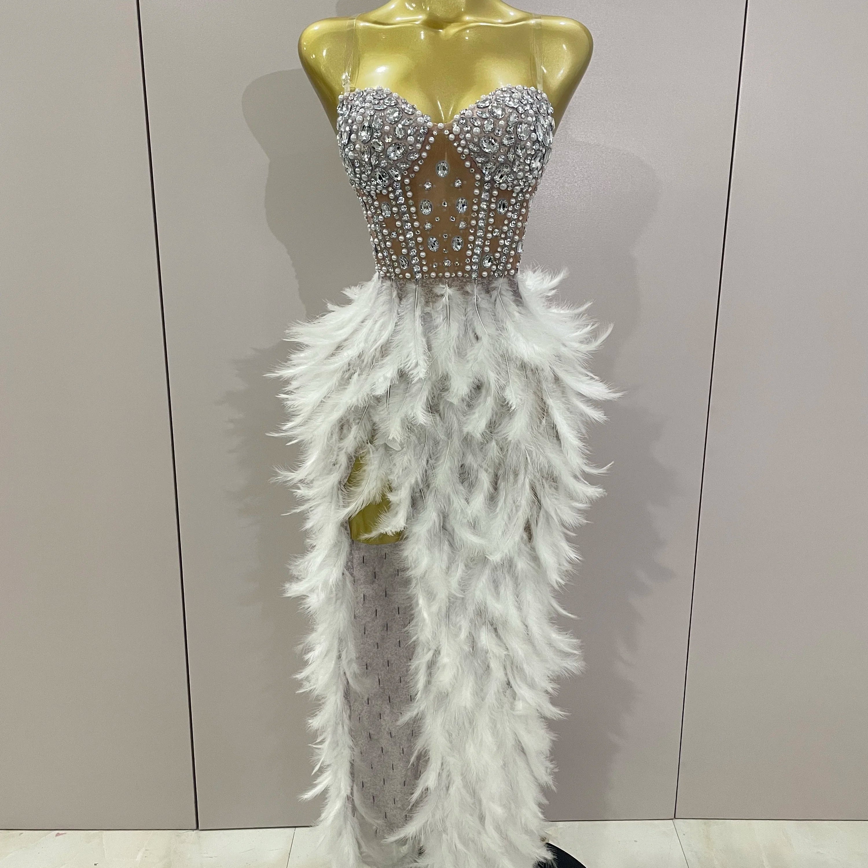 Robe longue sexy en maille avec plumes blanches et strass scintillants pour femme, tenue de soirée, d'anniversaire, de spectacle, de séance photo, 2025