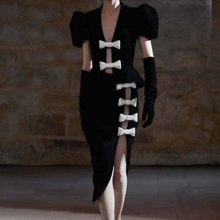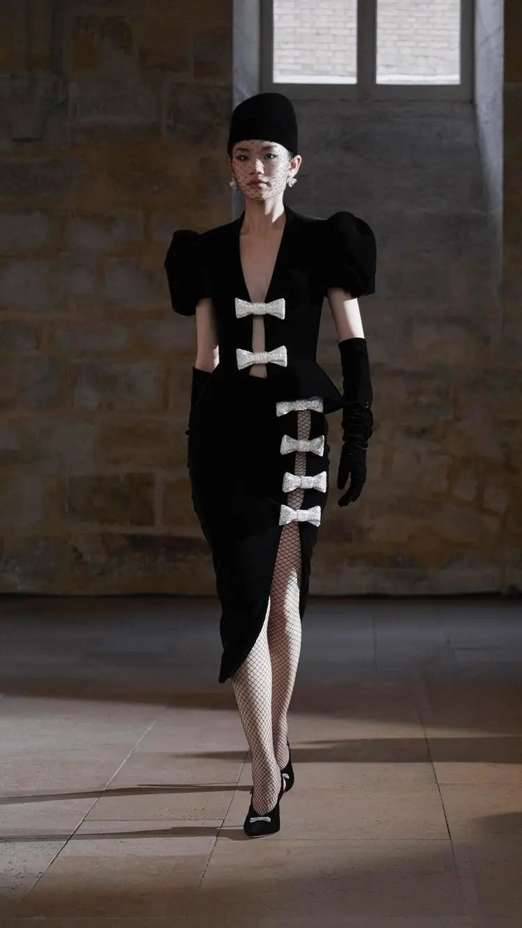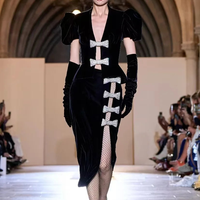 2025 New Fashion Gloves Black Velvet Woman Set Shining Diamond Bows V-Neck Jacket Sexy Hollow out package Hips Skirt Set 2 Piece