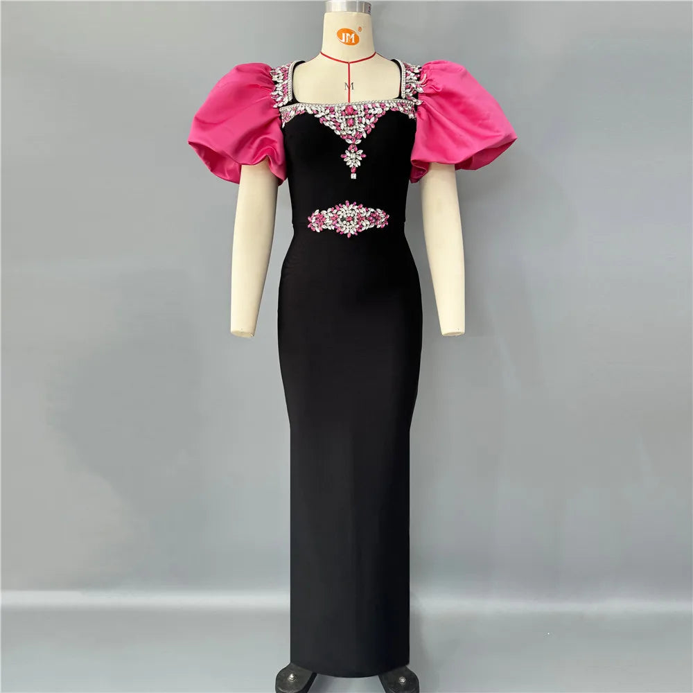 2025 New Fashion Women Sexy Puff Sleeve Square Collar Shinning Crystal Bodycon Long Bandage Dress Celebrate Evening Party Dress