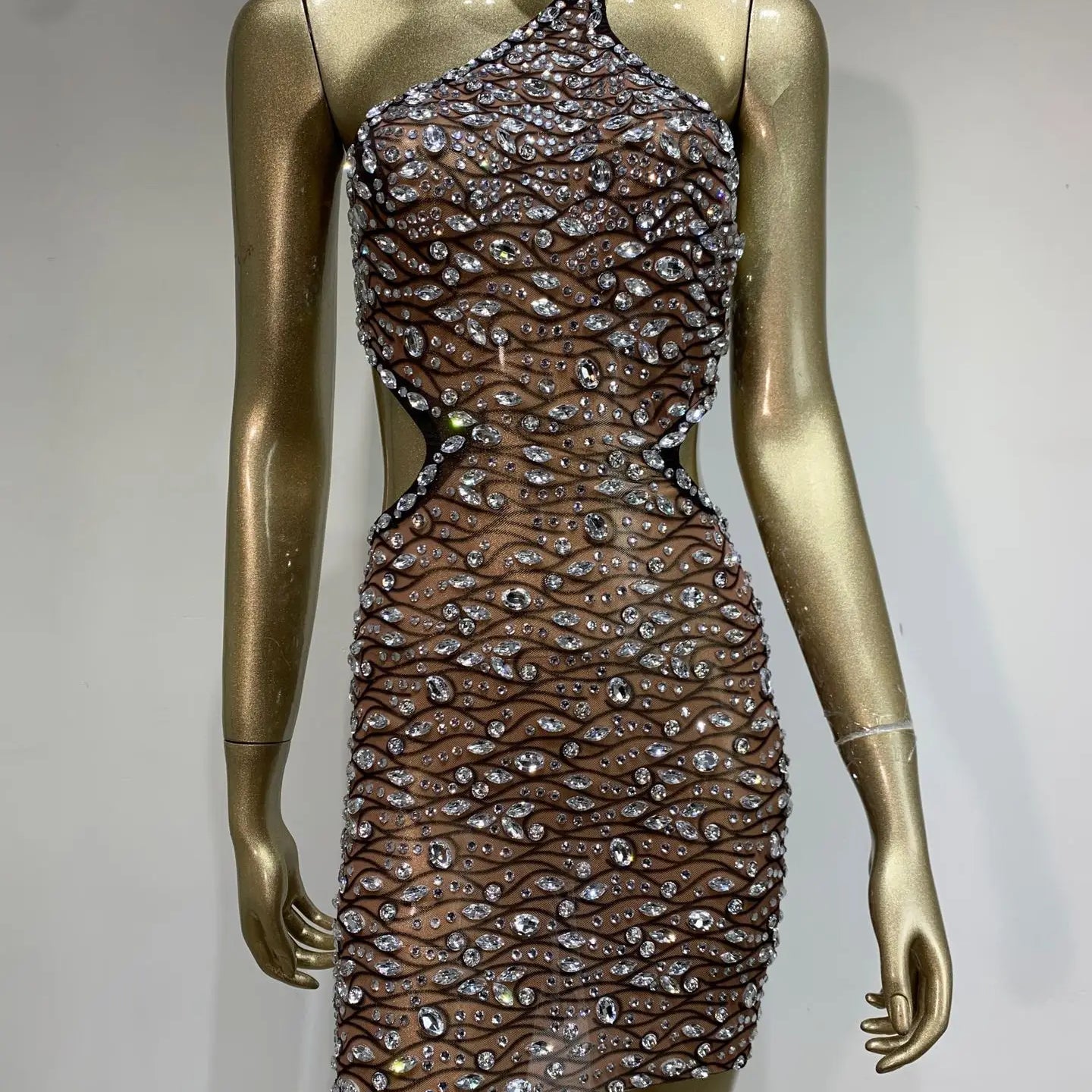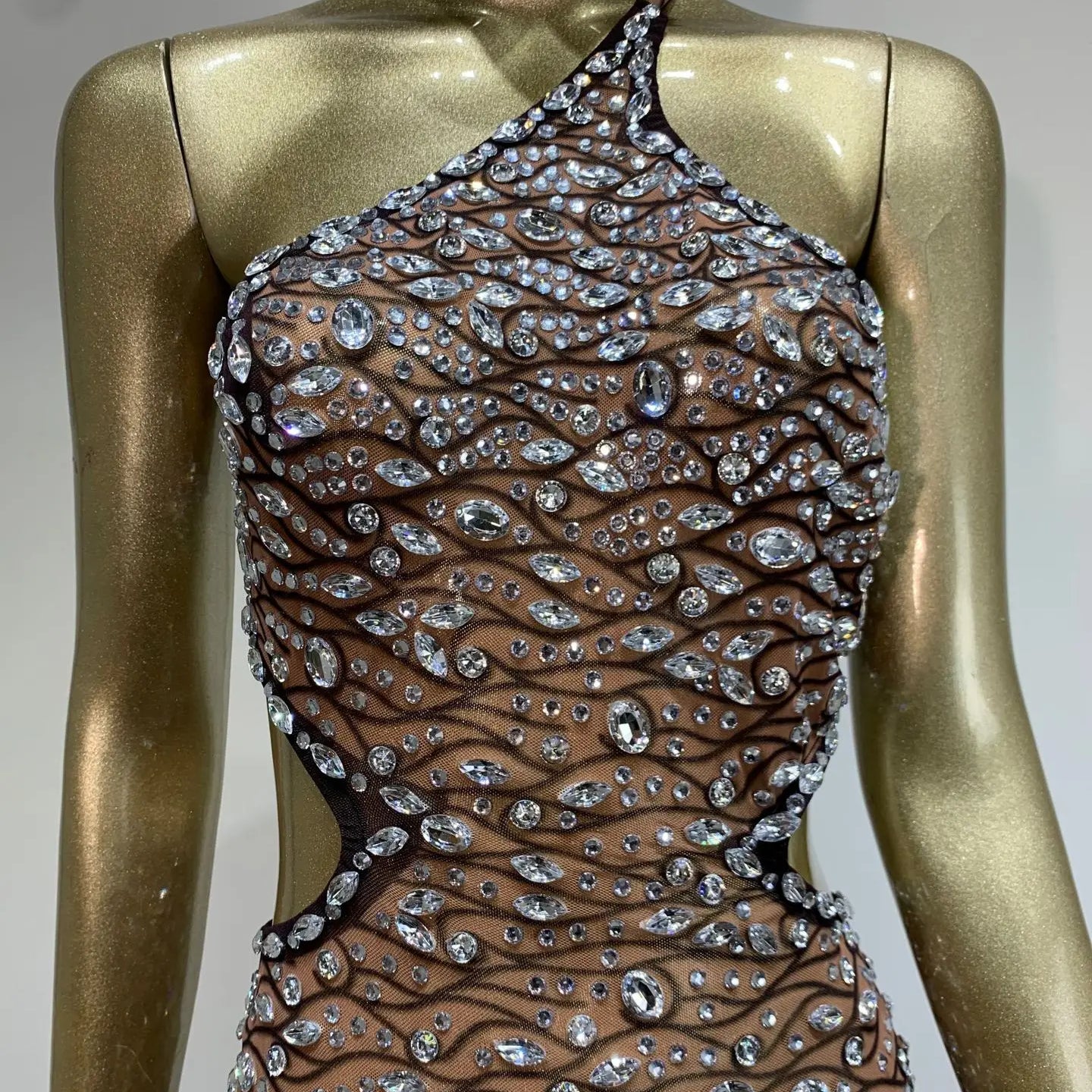 Robe courte sexy asymétrique à épaules dénudées et diamants pour femme, tenue de fête d'anniversaire, de bar, de discothèque, de spectacle sur scène, 2025