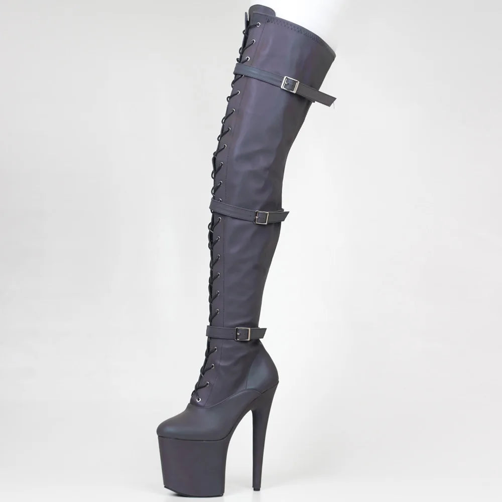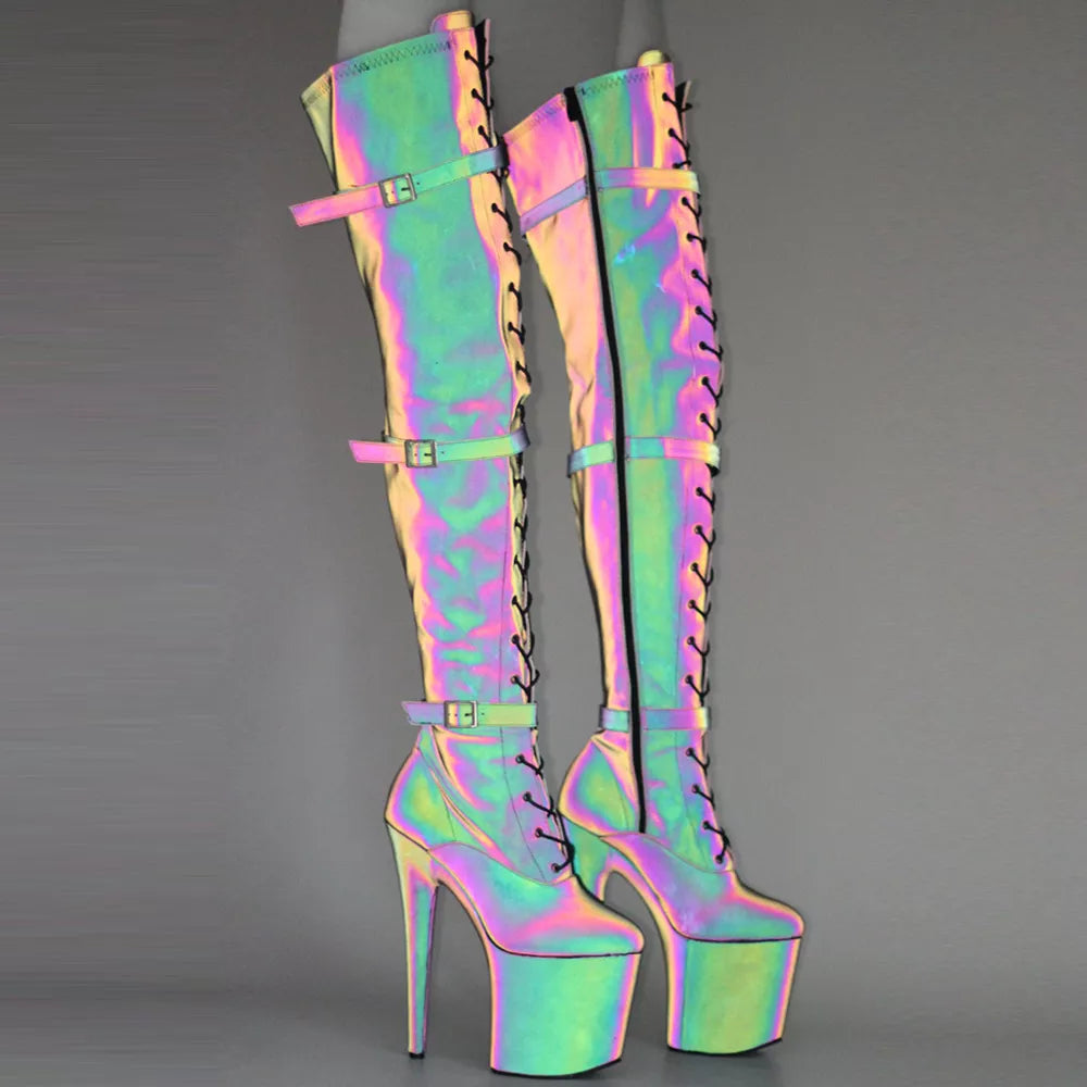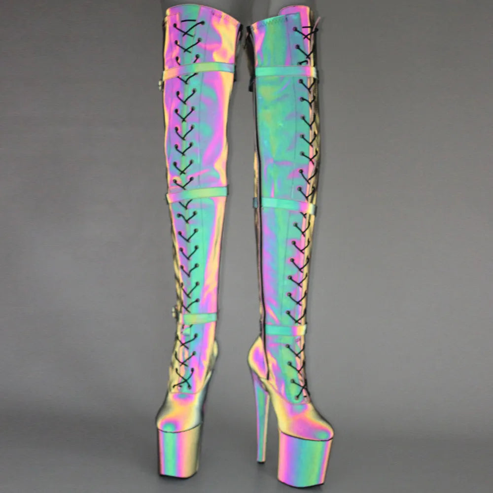 Cuissardes à lacets de 20 cm, chaussures à plateforme lumineuses et colorées en tissu réfléchissant pour pole dance