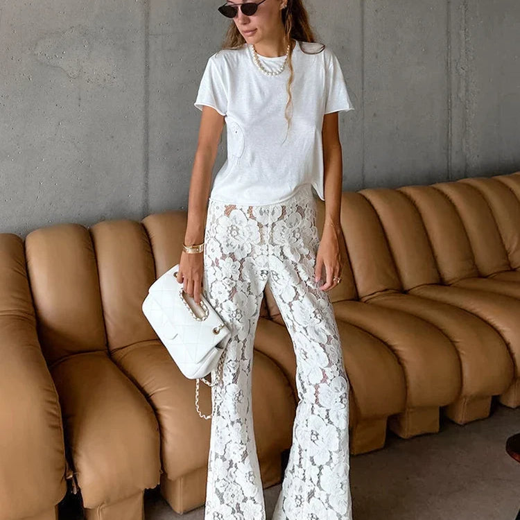 Mnealways18 Sexy Perspective White Flare Pants Summer Women Vacation High Waist Long Trousers Lace Beach Style Female Pants