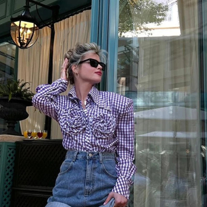 פיות גראנג '3D חולצה משובצת פרחונית משובצת 90s וינטג