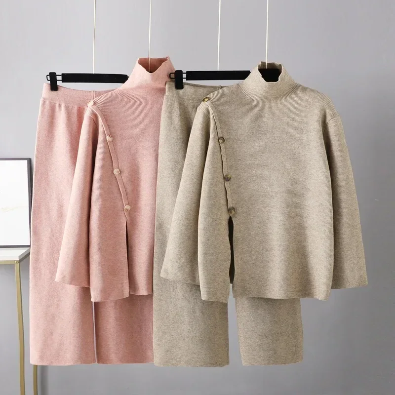 Two-piece Set Warmth Reduction Casual Wide Leg Pants Split Knit High Neck Sweater for Women's Winter