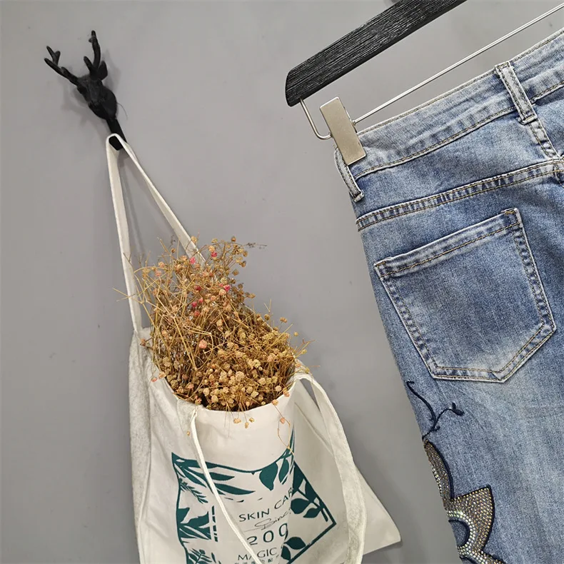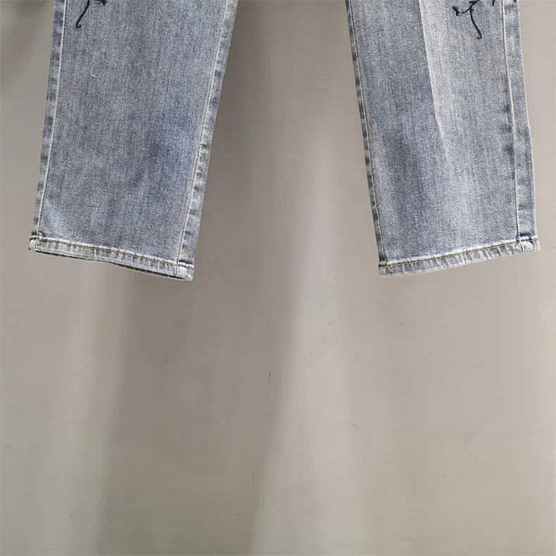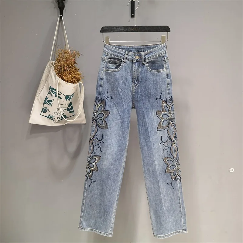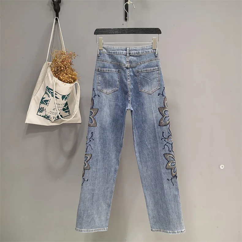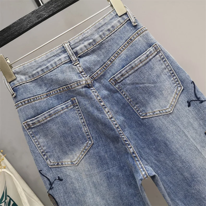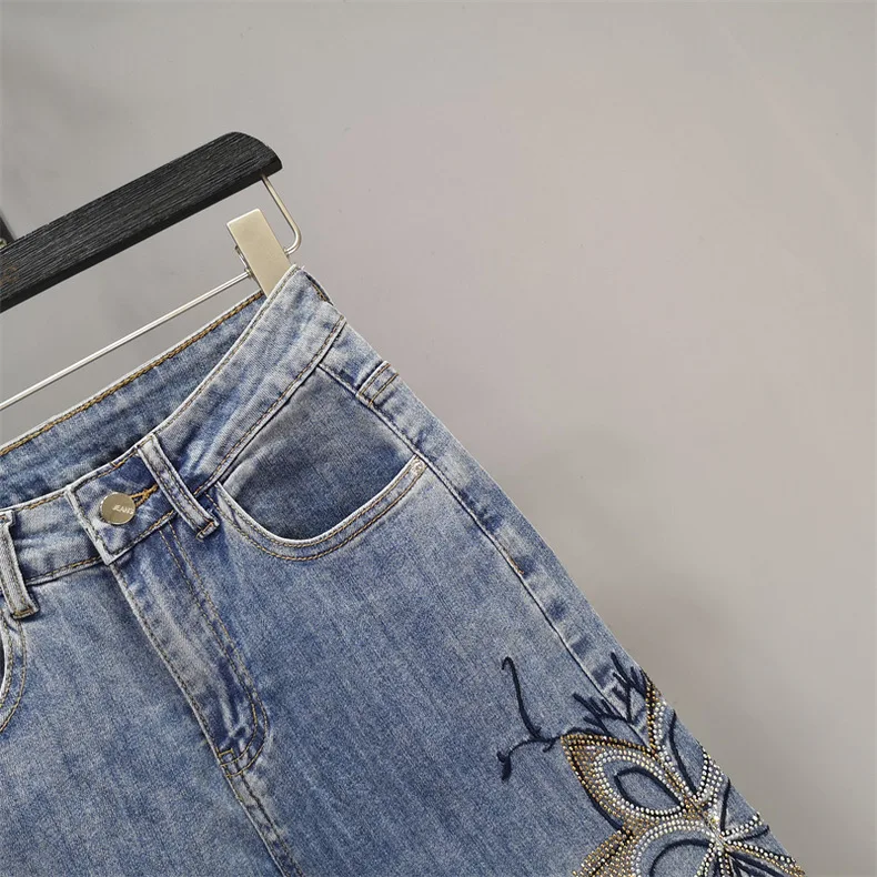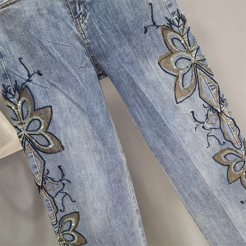 Summer Hollow Lace Jeans Women Panel Diamond Butterfly Feet Slim Fit Embroidered Long Pants Loose Hip Wrap Vintage Stretch