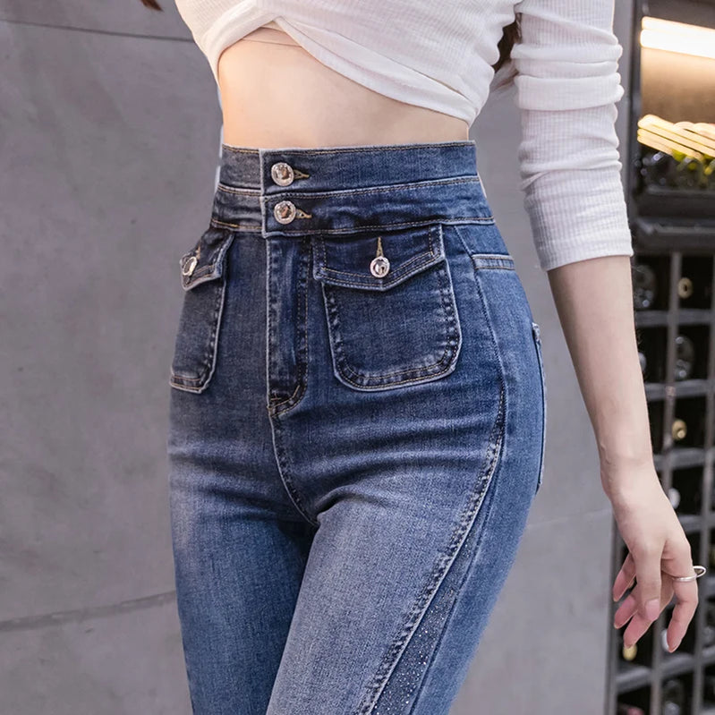 Rhinestone Flared Jeans For Women Soft Skinny Patchwork Boot-Cut Denim Trousers Mujer Fashion Stretch Pants Ladies Blue