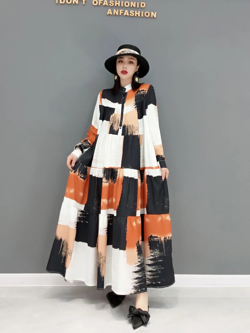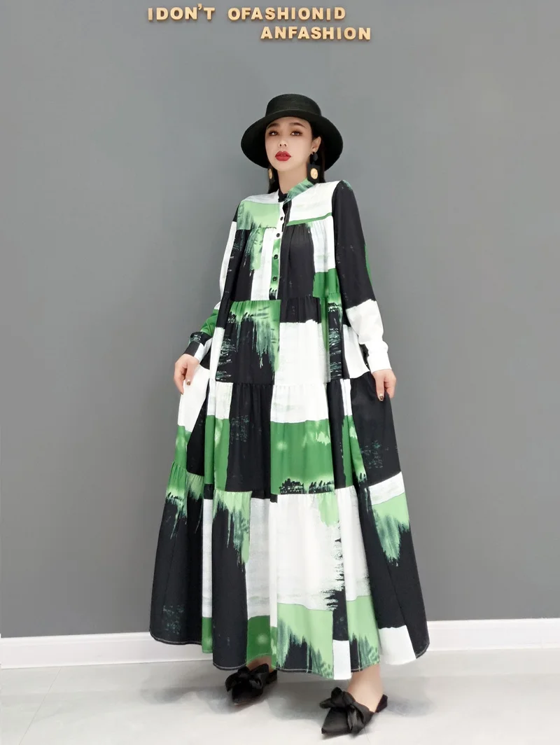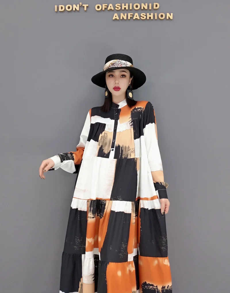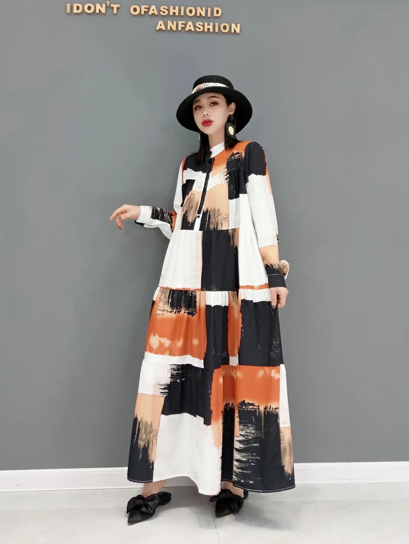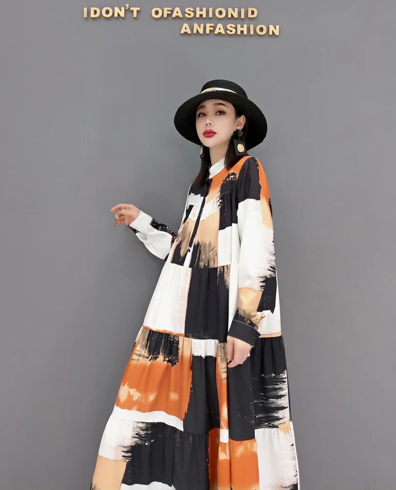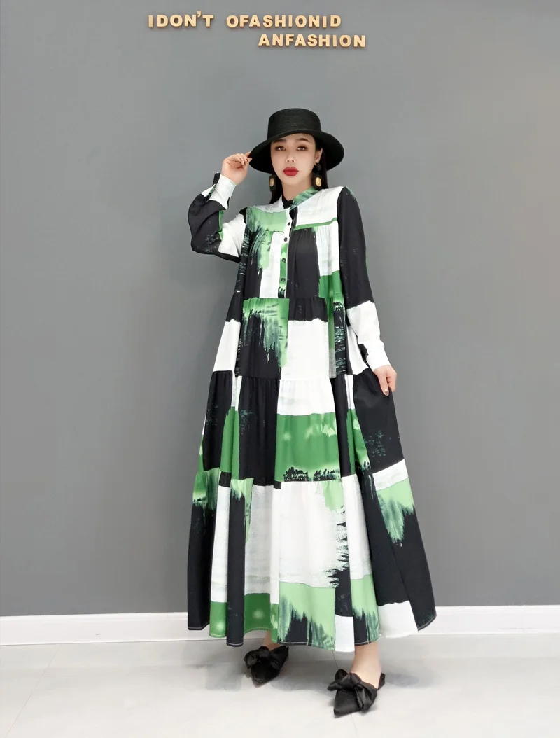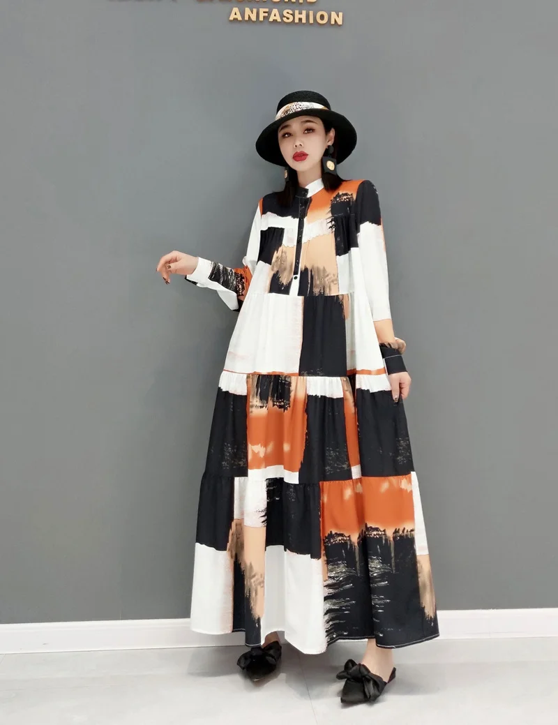 SHENGPALAE Autumn Fashion Tide Dress For Women Stand-up Collar Long Sleeve Printing Elegant Loose Fit Female Robe 5AE209