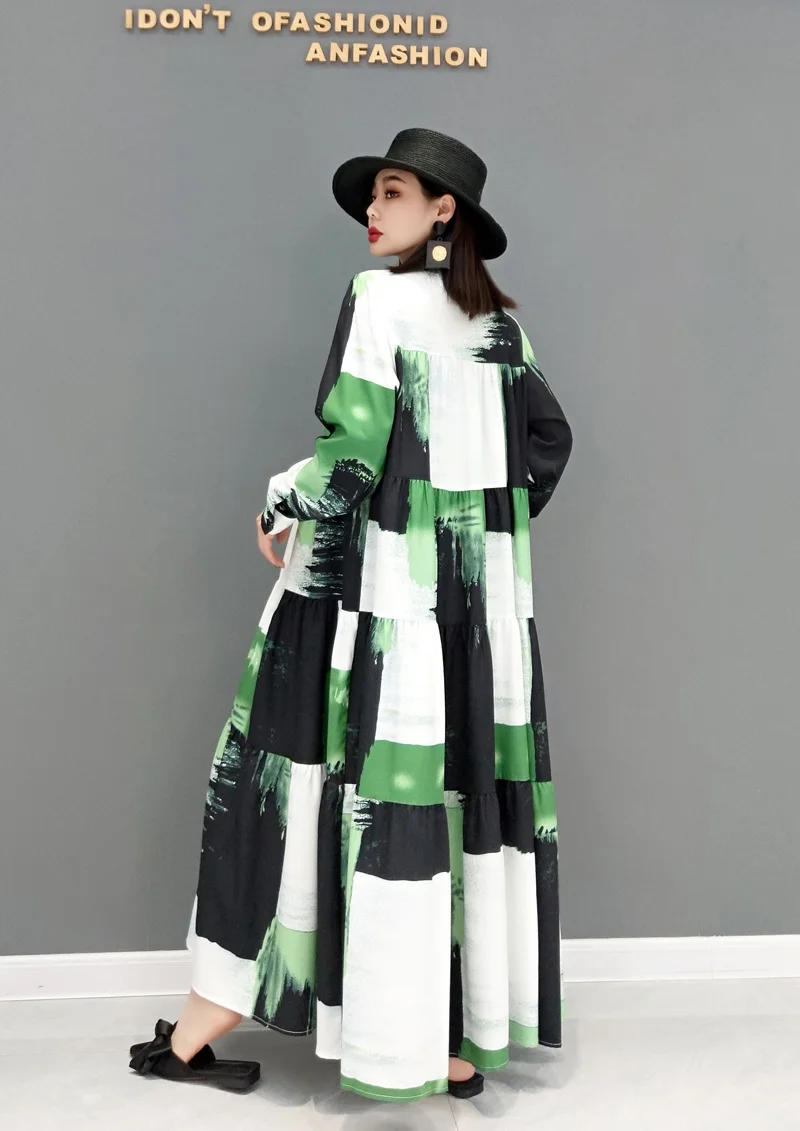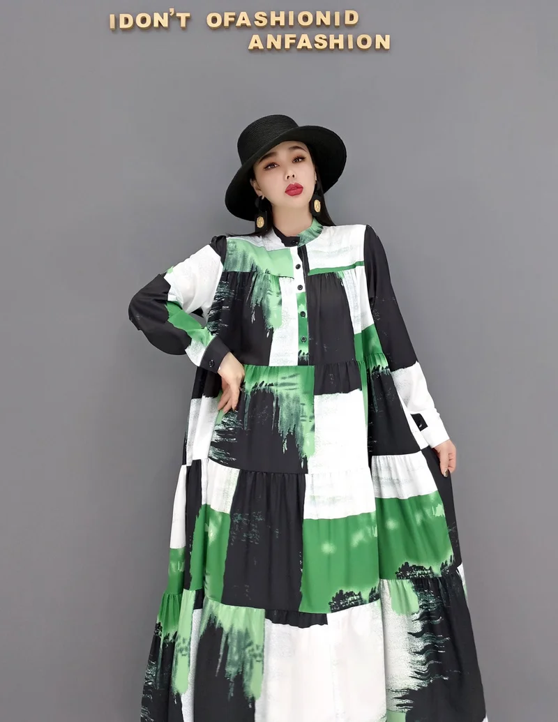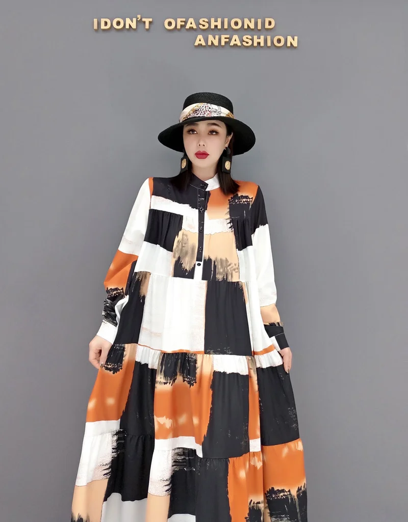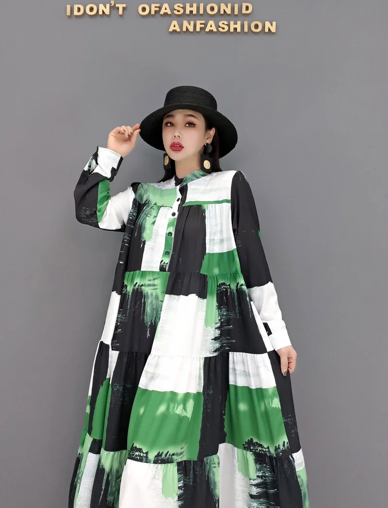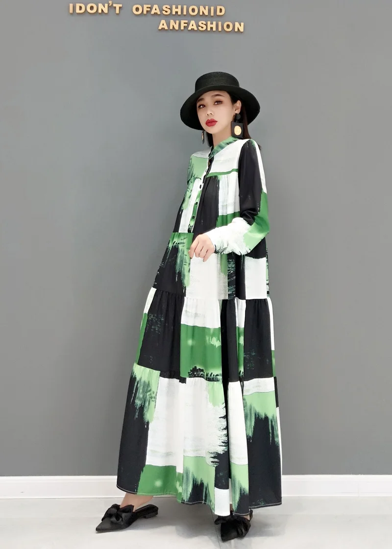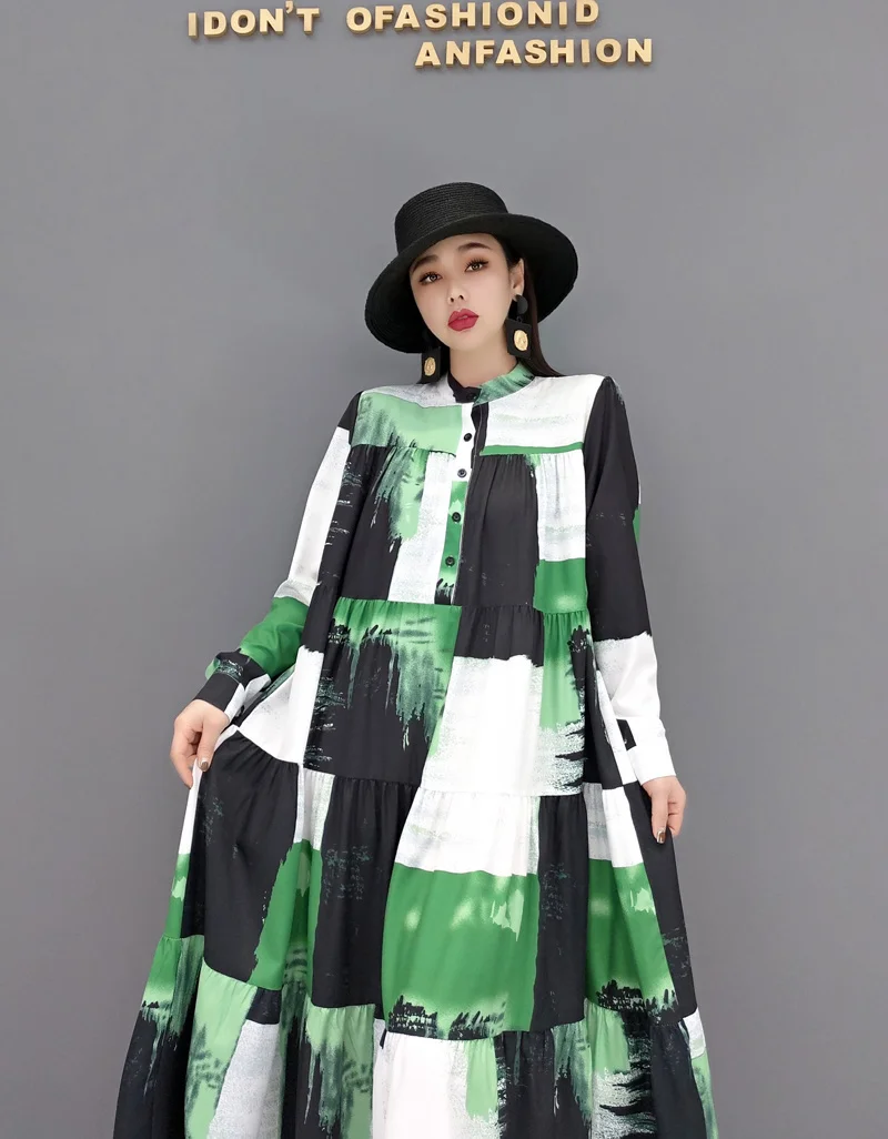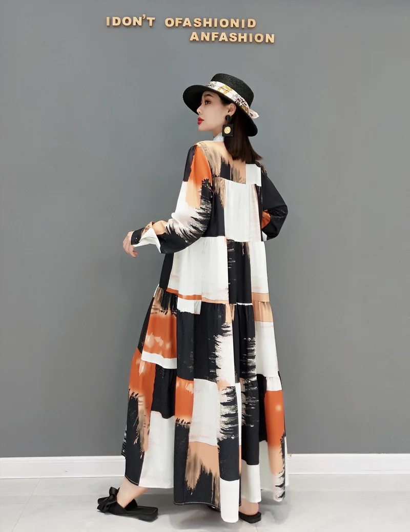 SHENGPALAE Autumn Fashion Tide Dress For Women Stand-up Collar Long Sleeve Printing Elegant Loose Fit Female Robe 5AE209