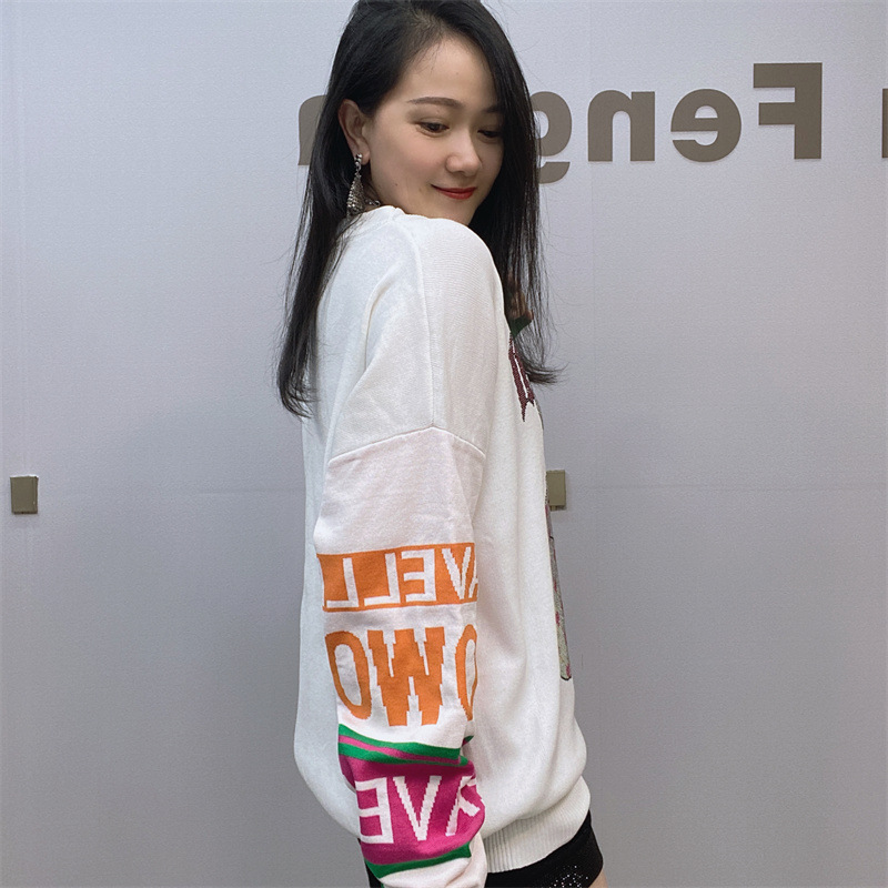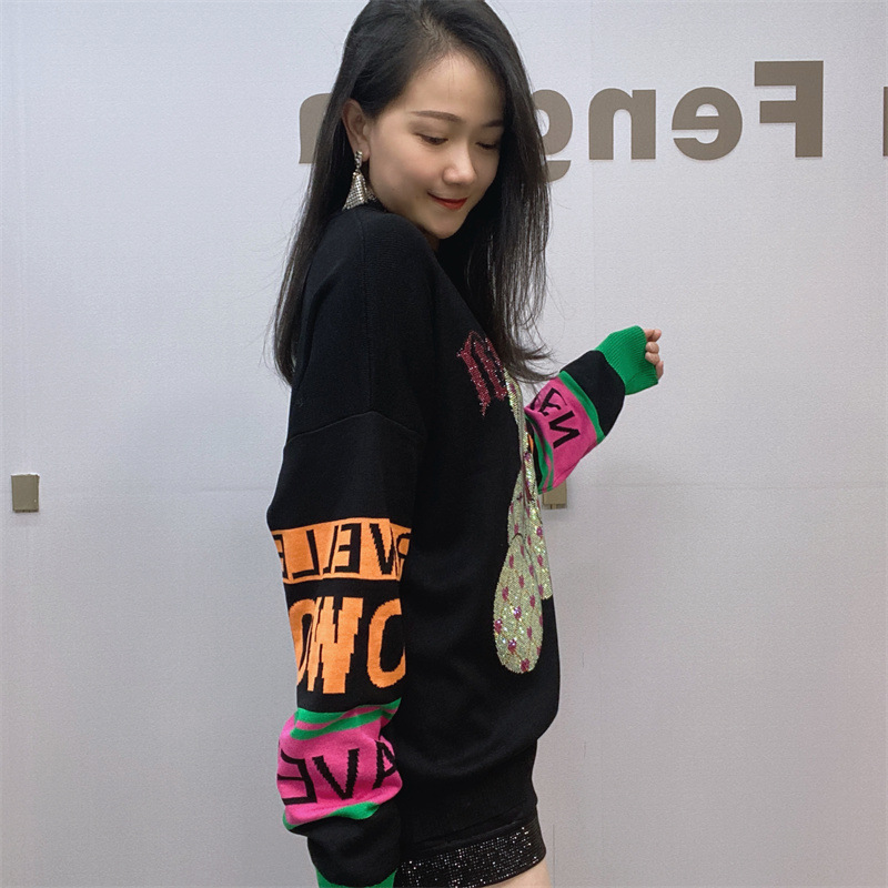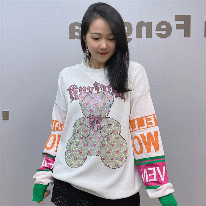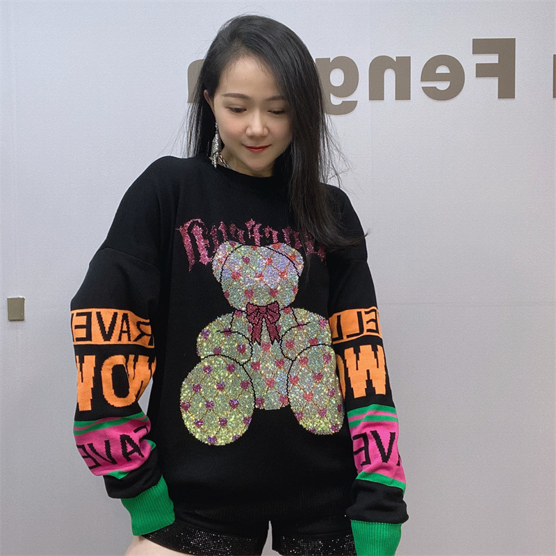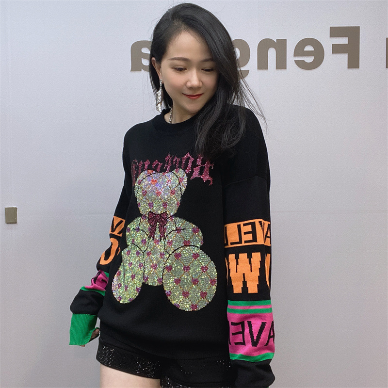 Fashion Cartoon Bear Rhinestone Long Sleeve Sweater Female Round Neck Black Cotton Long knitted Sweater Pullover For Women