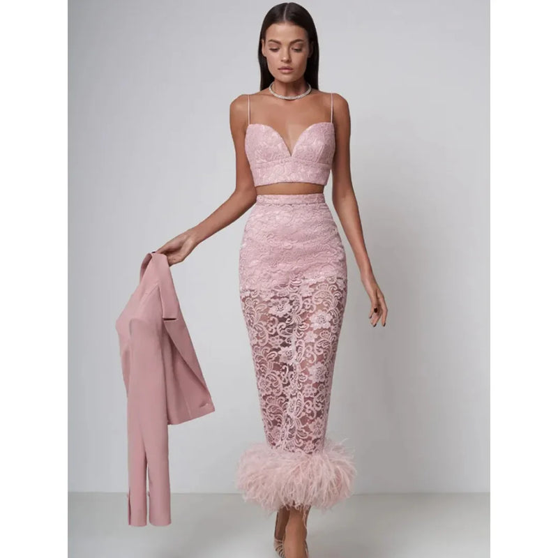 Women Sexy V Neck Lace Feather Midi Skirt Bandage Set Celebrity Elegant Evening Club Cocktail Party Outfits