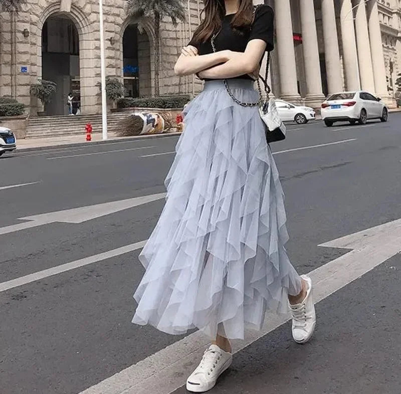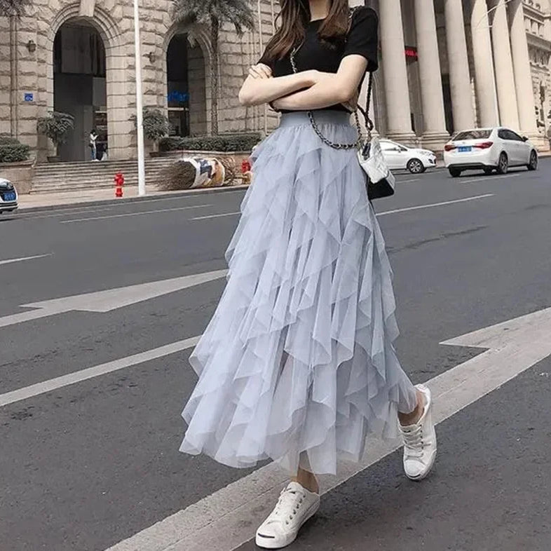 Women Tulle Mesh Skirt Elegant Elastic Waist Fairy Long A-line Tutu Skirt for Spring Summer long skirt