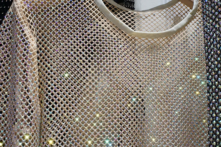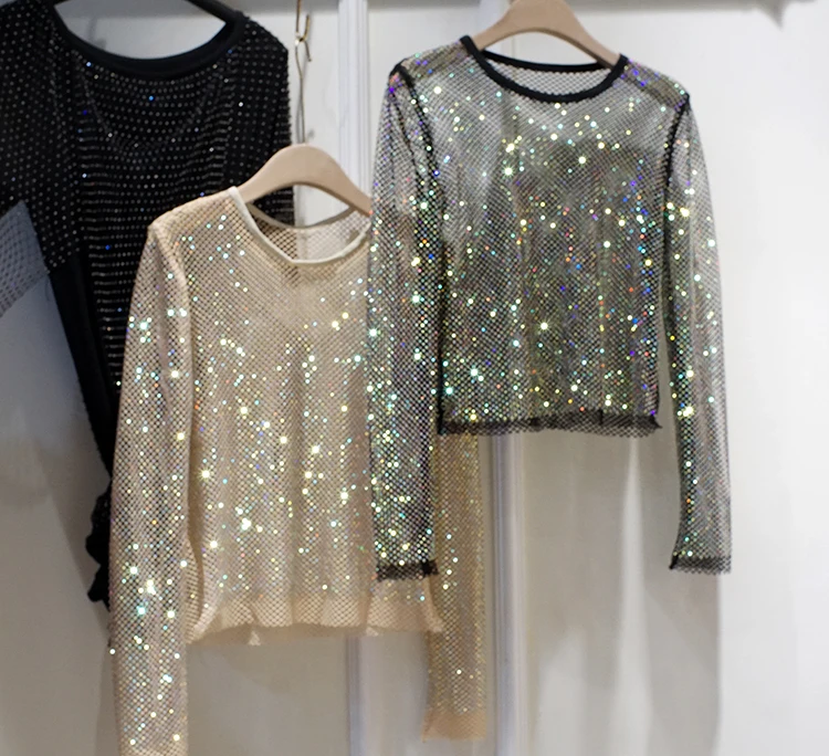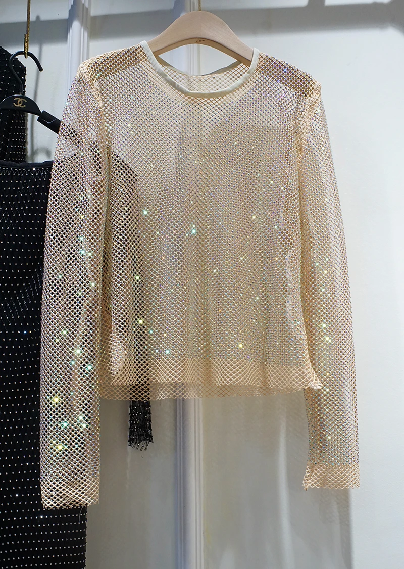 Ladies Temperament Rhinestone Round Neck Long Sleeve Bright Starlight Hollow Shiny Bottoming Shirt Women's Top Trend