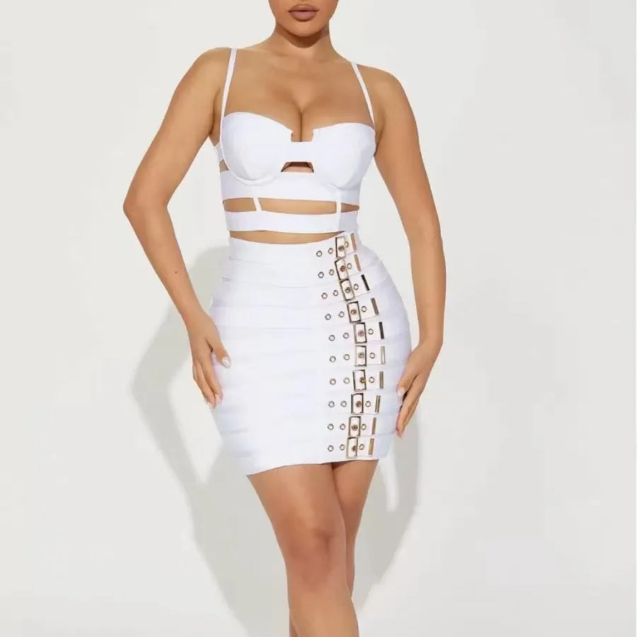 2025 Summer women's new white sexy camisole top+belt buckle mini skirt fashionable 2 piece bandage set
