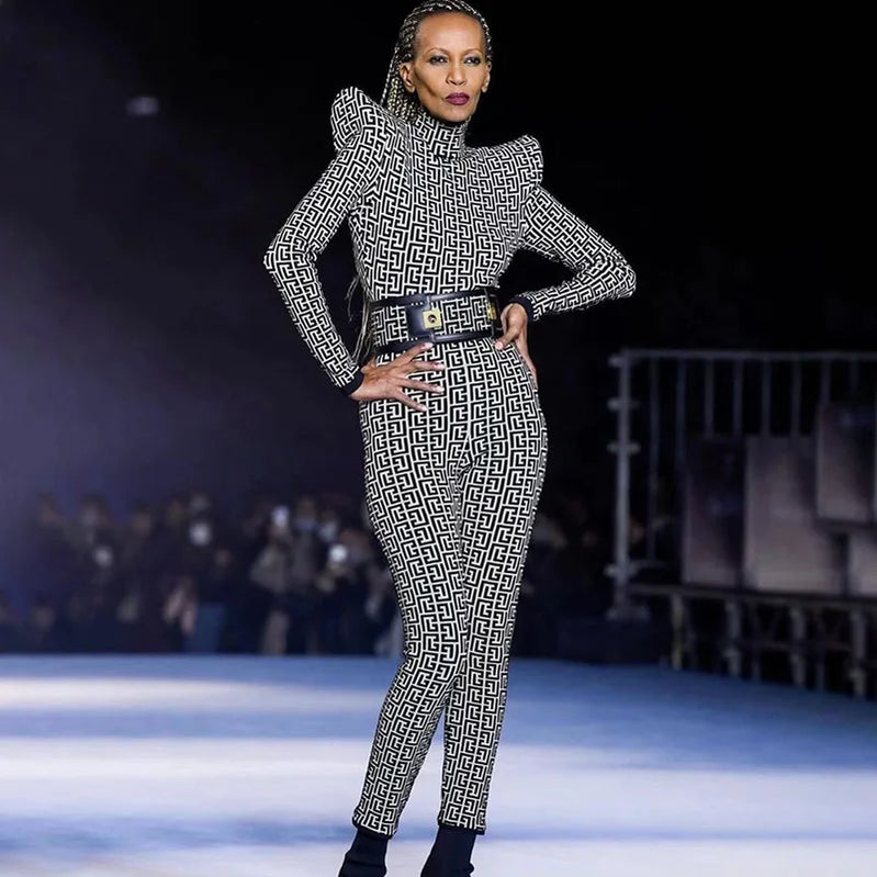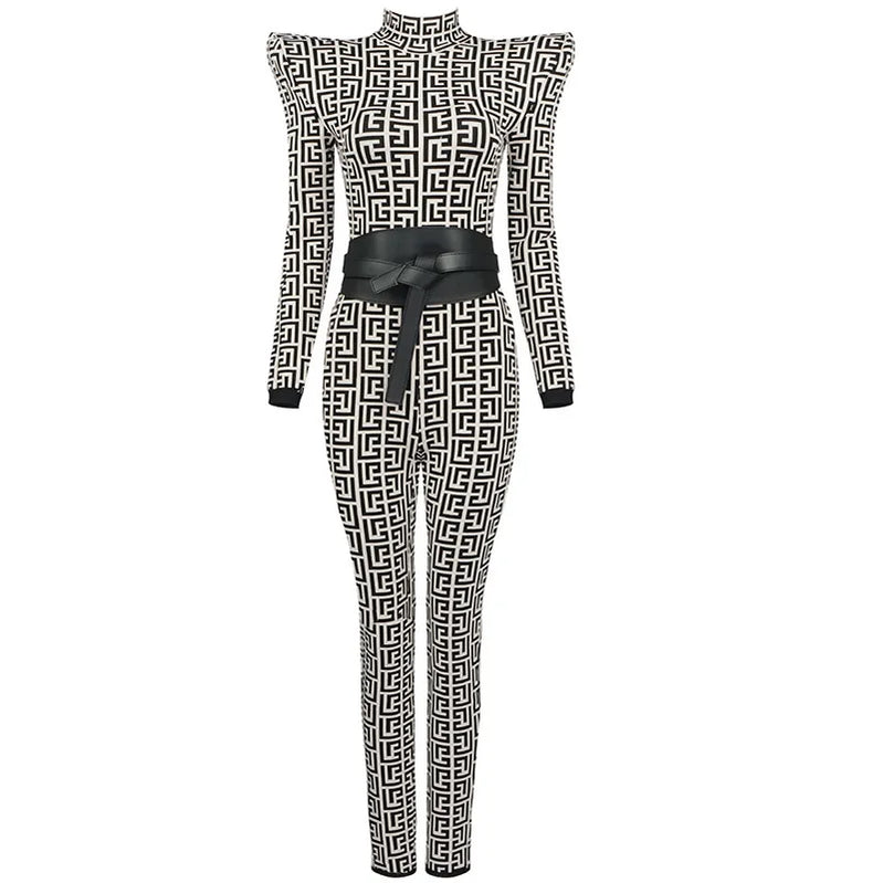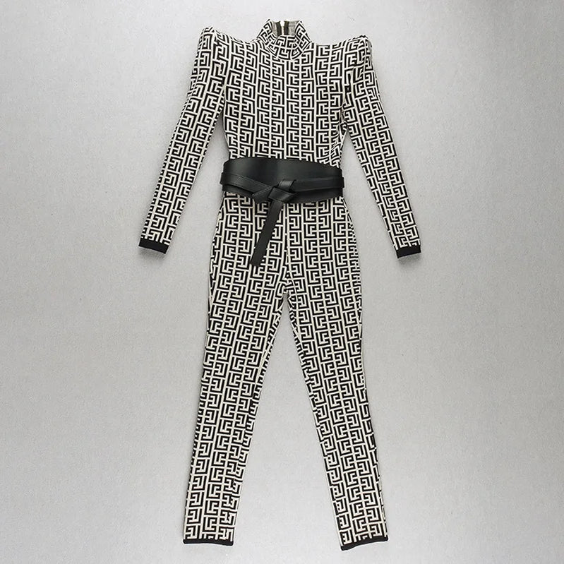 Europe and America Fashion Sexy Round Neck High Neck Long Sleeve One-Piece Trousers Jacquard Black Sexy Cross-Border