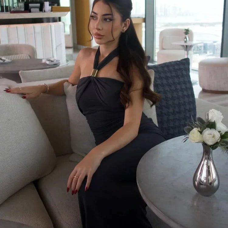 Elegant Sleeveless Backless Solid Color Midi Vestidos Woman Fashion Metal Ring Pleat Long Dresses New Summer Slim Fit Lady Robes