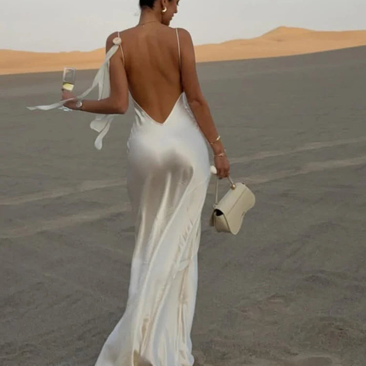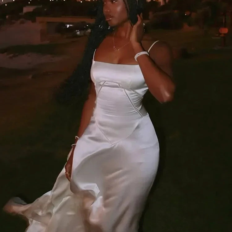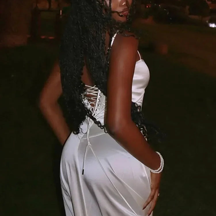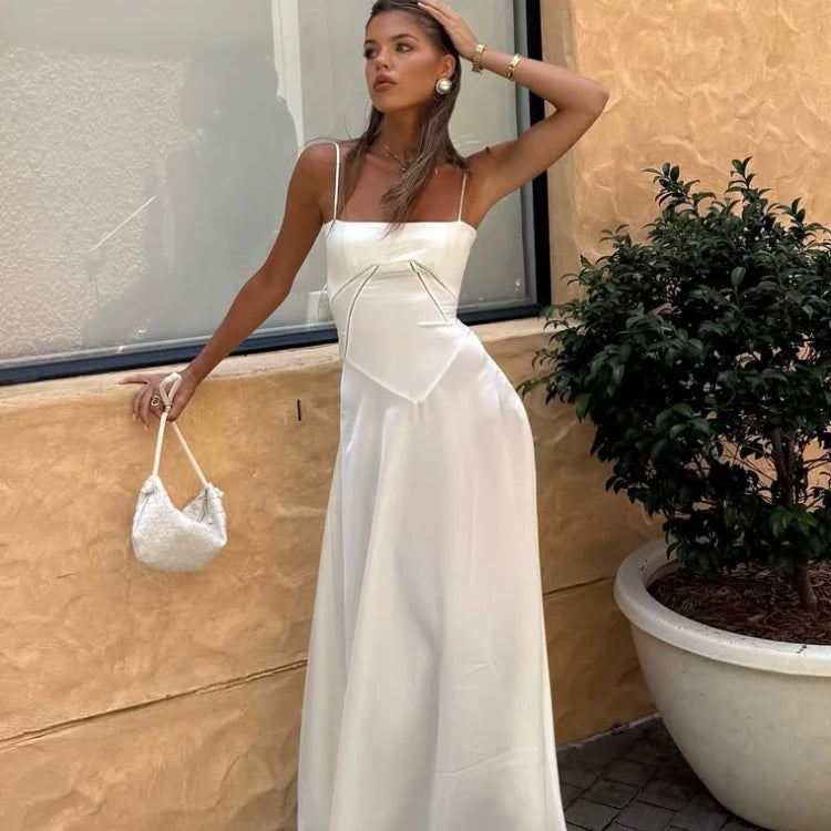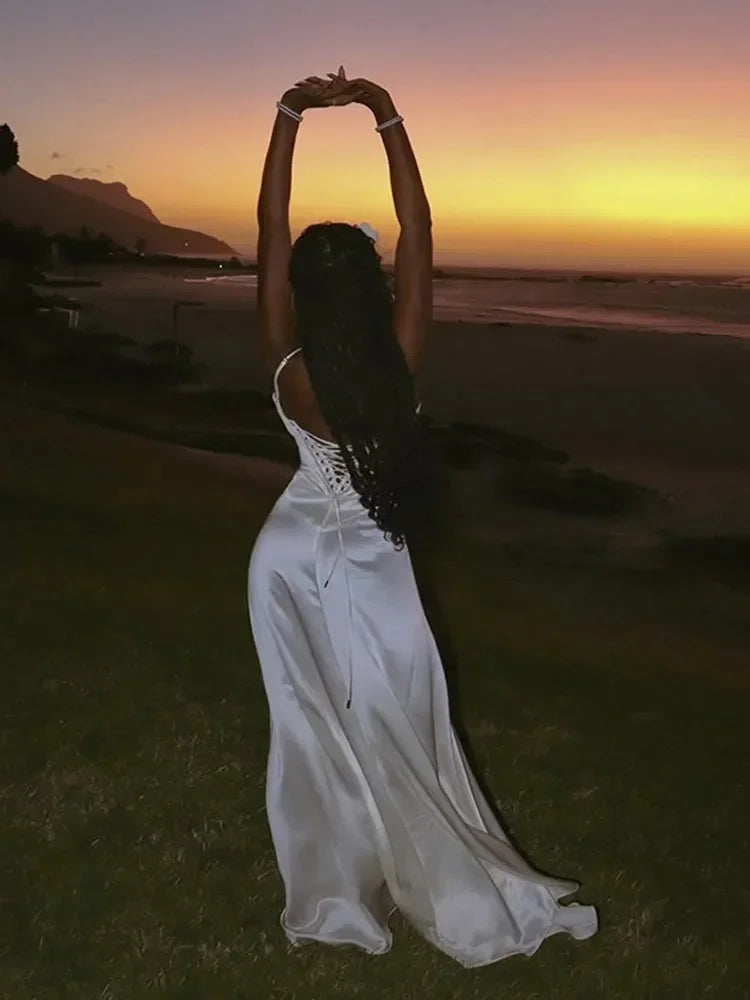 Elegant Solid Satin Ruffles Sling Long Dress Lady Sexy Square Collar Backless Sleeveless Lace Up Robes Chic Women Party Dresses