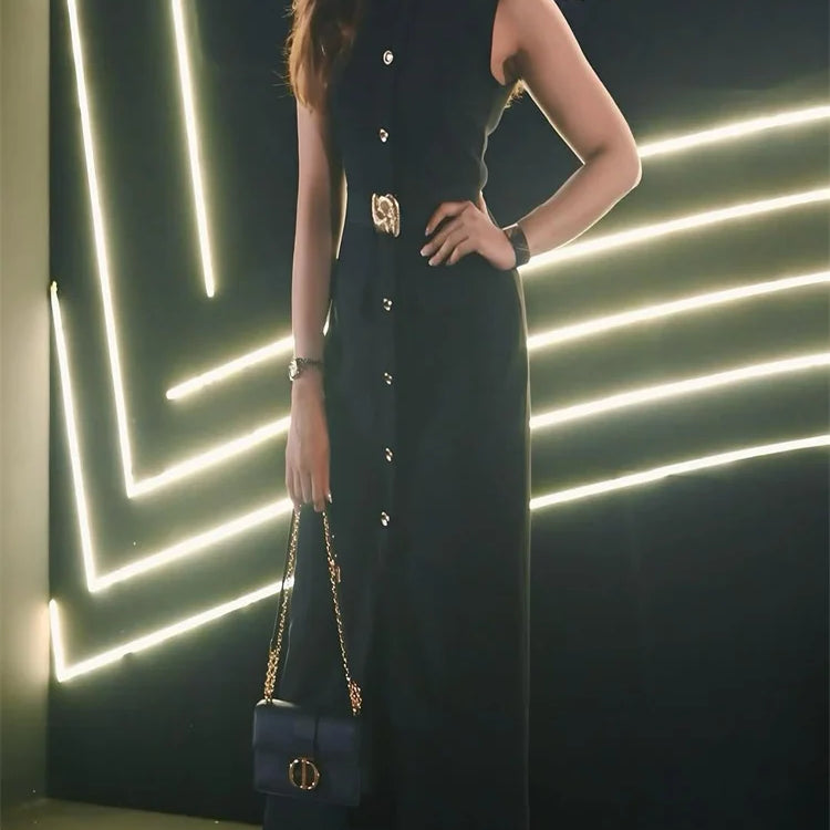 Elegant Split Women 's Maxi Dress O-neck Sleeveless Single Breasted Waist Cinching Pocket Female Dressess Summer Lady Vestidos