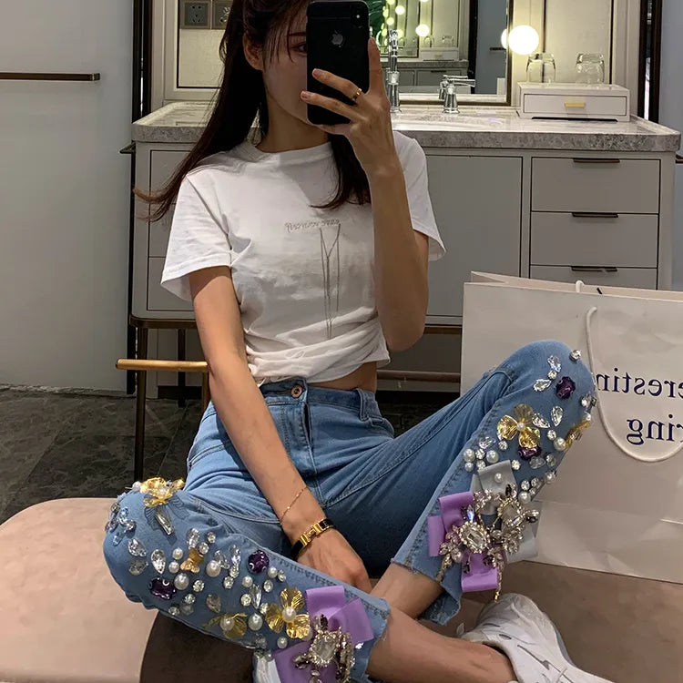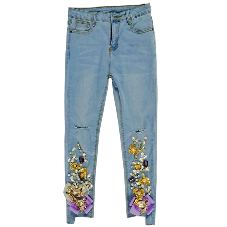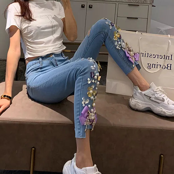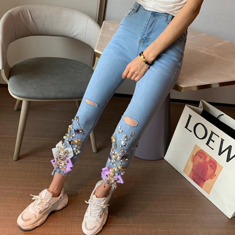 Haftowane kobiety Diamentowe dżinsy dżinsy kobiety bling bling hole moda z koralikami chude szczupłe spodni ołówkowy