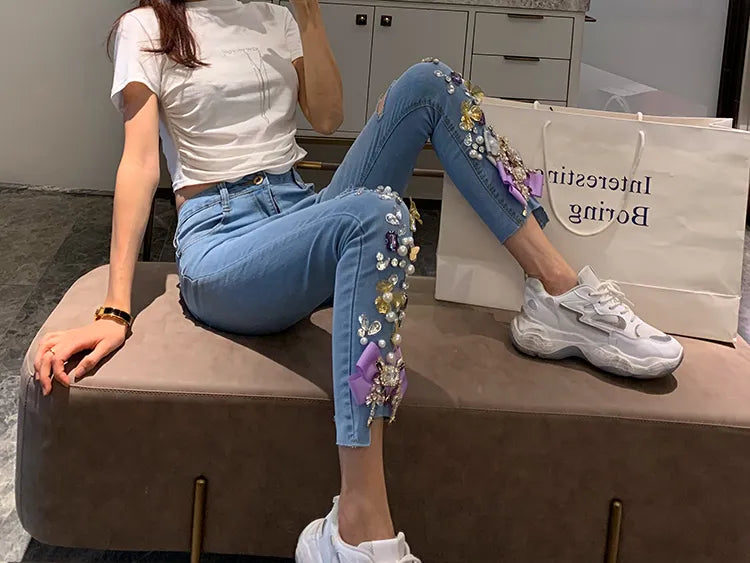 Haftowane flares damskie dżinsy dżinsy dżinsy kobiety bling hole moda z koralikami chude szczupłe spodnie ołówkowe