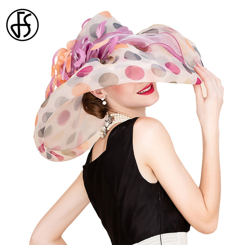 FS Oversized Brim Dot Organza Top Hats For Women Beach Visor Sun Sombreros Flowers Fedora Lady Wavy Edge UV Protection Derby Cap