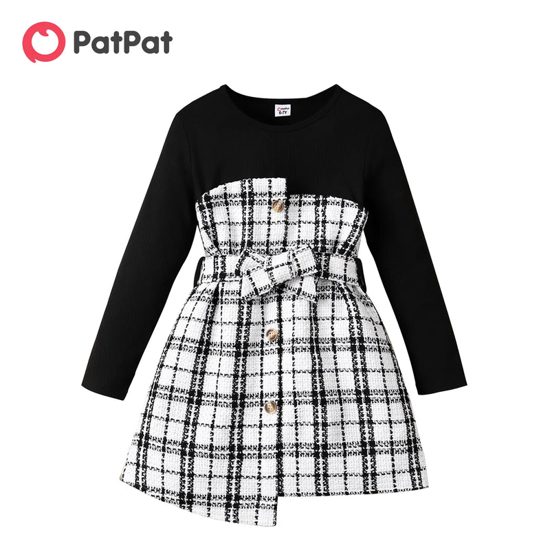 Dress for Girl Kid Girl Plaid Tweed Splice Button Design Irregular Hem Long-sleeve Girl Dresses for 5-12 Y