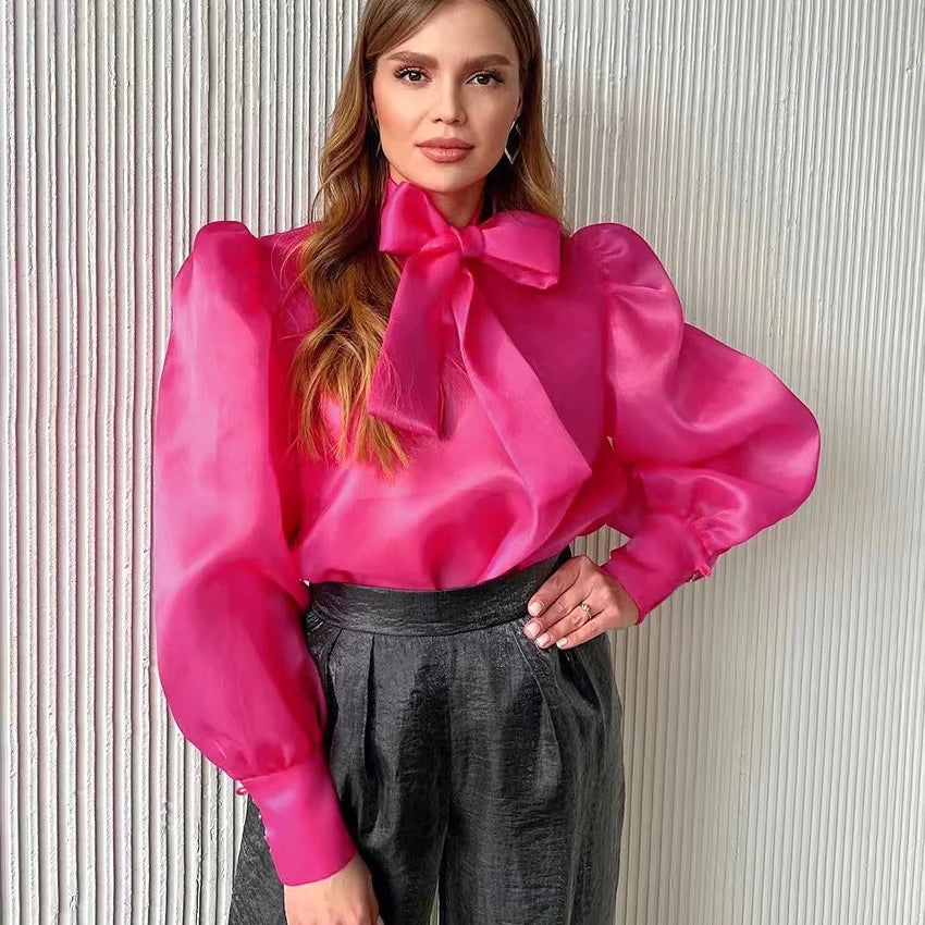 Camisas de malha femininas elegantes, manga bufante, laço, blusas de amarrar, moda feminina para escritório, cor sólida, casual, solta, blusa sexy