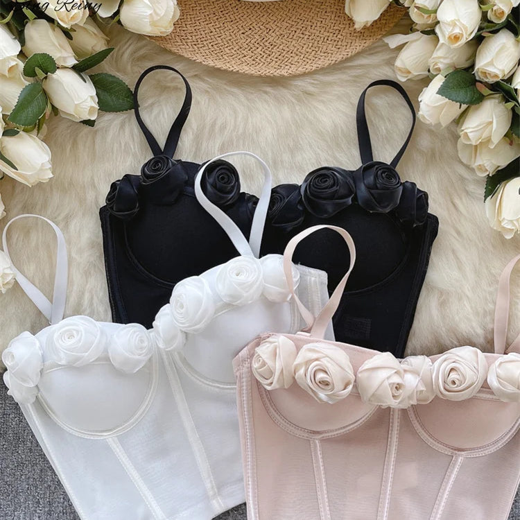 SINGREINY Feminino Rosa 3D Flor Sexy Camisola Sem Mangas Sem Alças Regatas Curtas Mulheres Bainha Corset Streetwear Camisolas