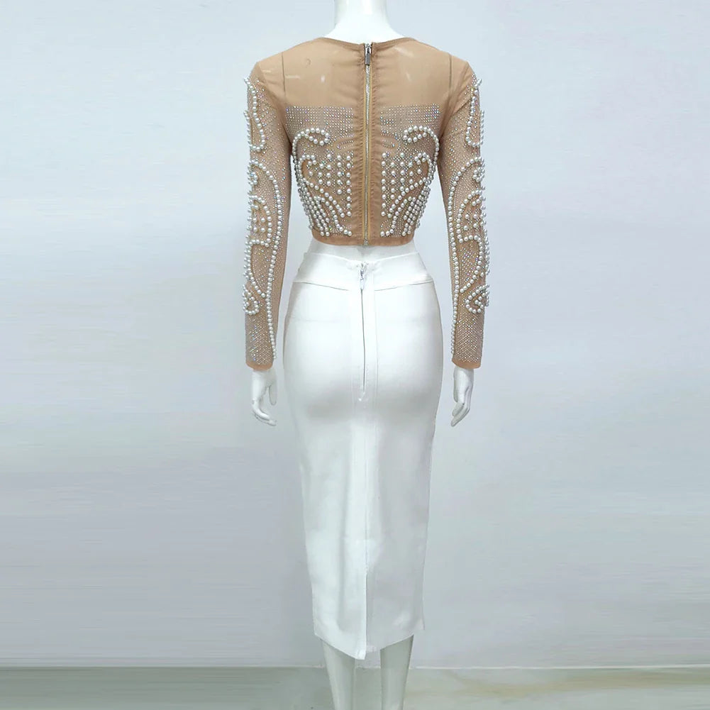 Conjunto de duas peças preto e branco de celebridades, com contas de pérolas, vestido de bandagem de rayon vazado, vestido de festa da moda